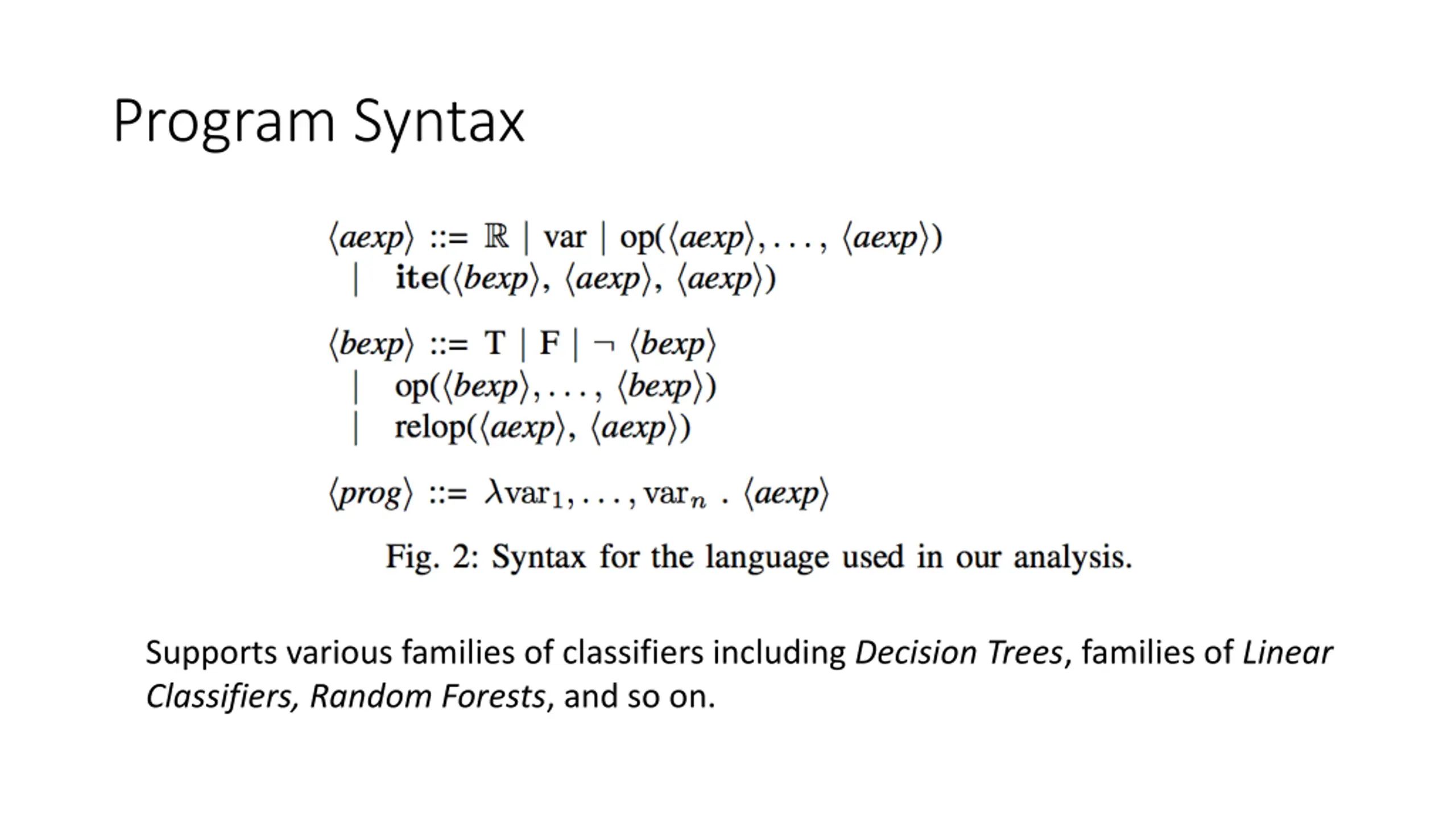 Program Syntax Supports various families of classifiers including Decision Trees, families of Linear Classifiers, Random Forests, and so on.
