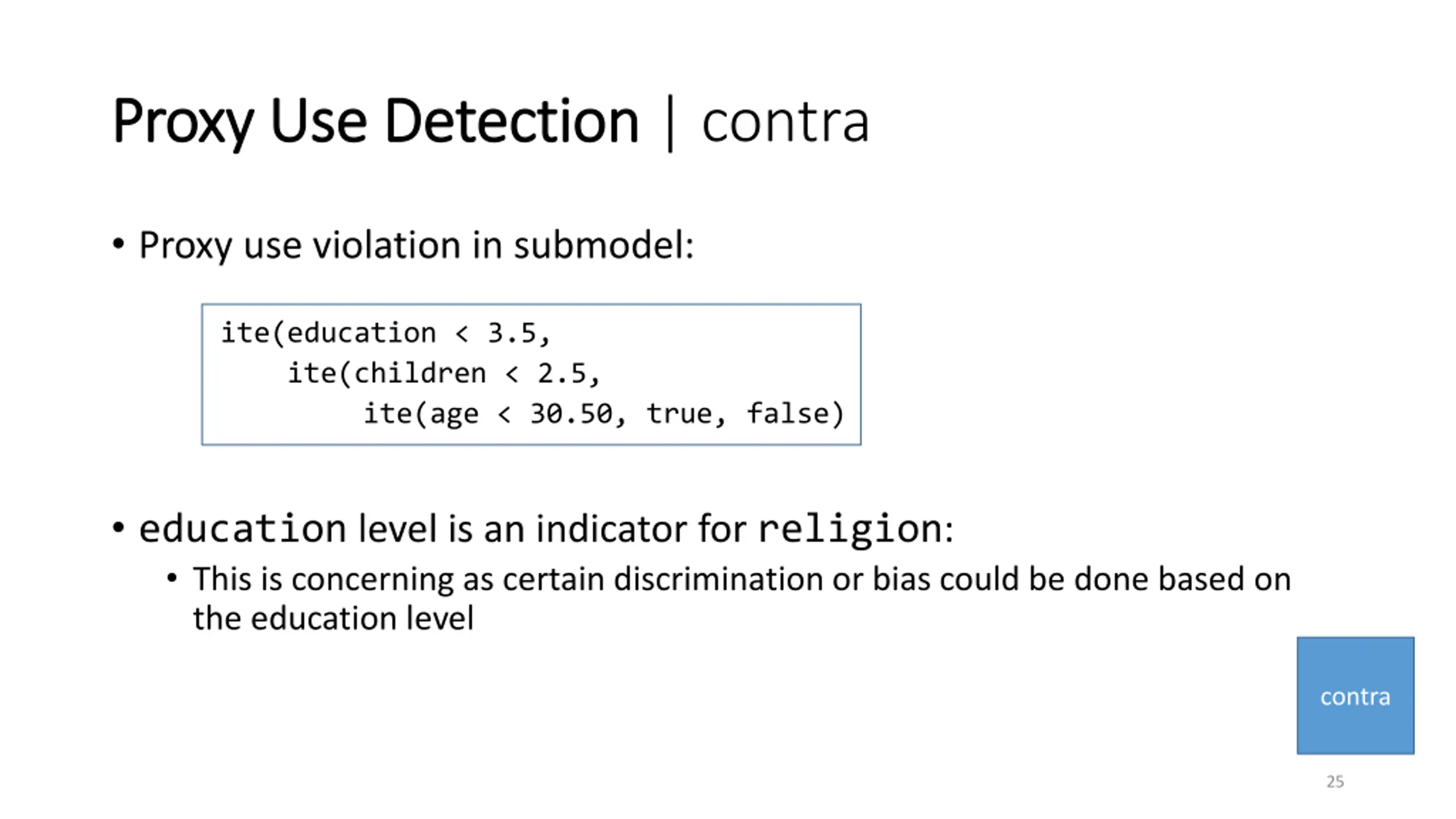 Proxy Use Detection Proxy Use Detection | contra Proxy use violation in submodel: ite(education < 3.5, ite(children < 2.5, ite(age < 30.50, true, false) education level is an indicator for religion: This is concerning as certain discrimination or bias could be done based on the education level contra 25