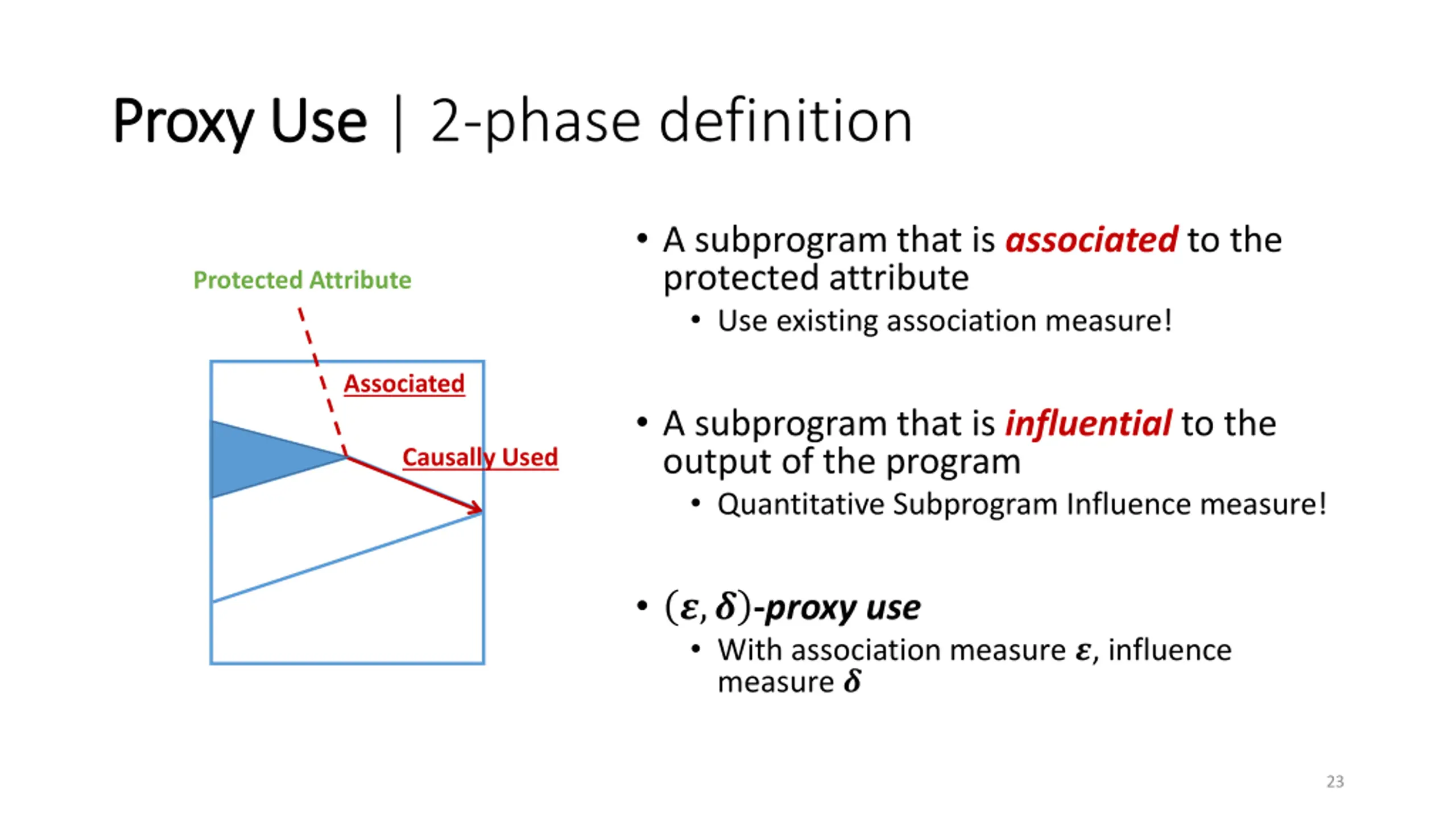 Proxy Use Proxy Use | 2-phase definition A subprogram that is associated to the protected attribute Use existing association measure! Protected Attribute Associated A subprogram that is influential to the output of the program Quantitative Subprogram Influence measure! Causally Used ?,? -proxy use With association measure ?, influence measure ? 23