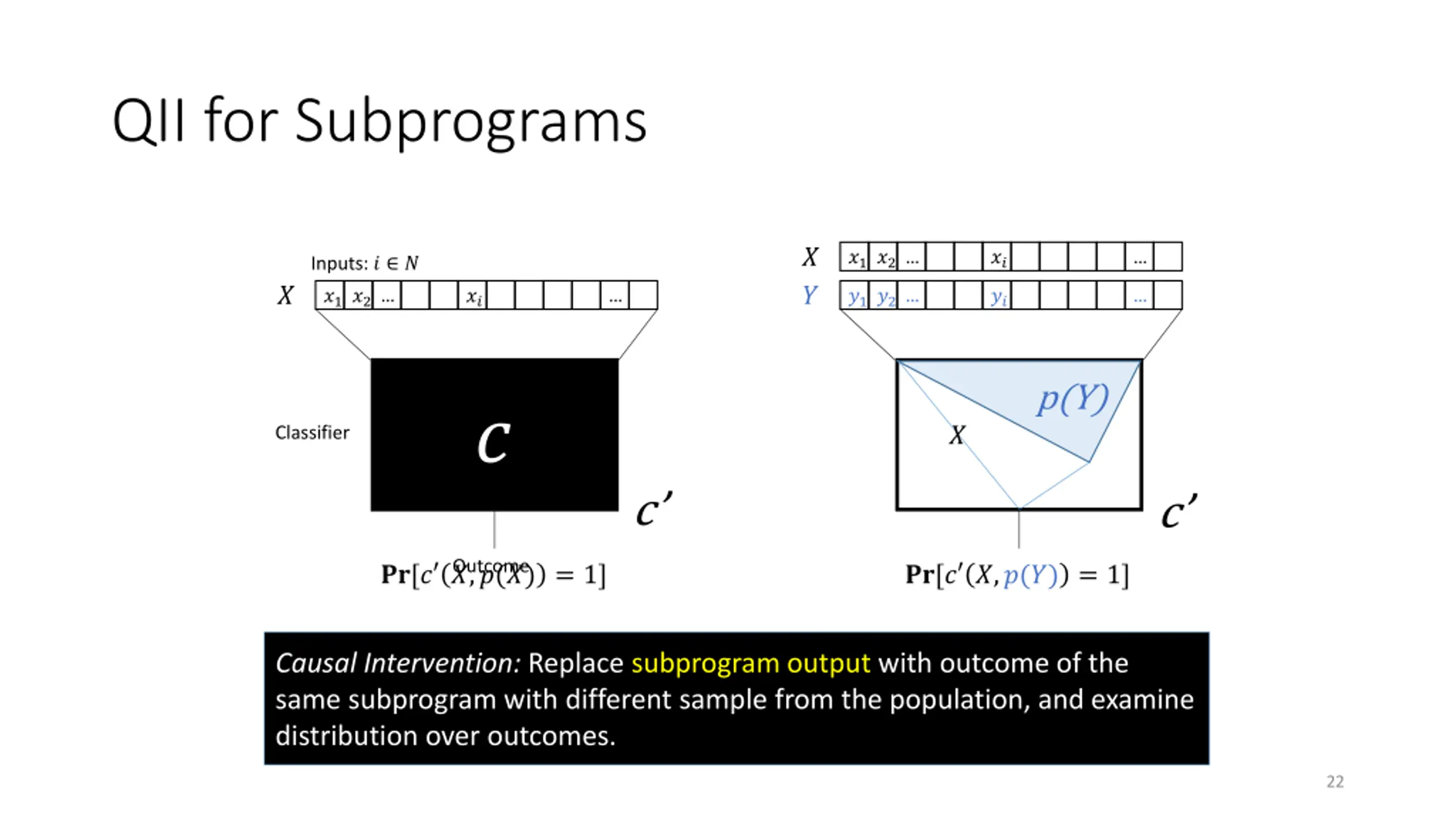 QII for Subprograms ? ?1?2 ?? Inputs: ? ? ? ? ?1?2 ?? ?1?2 ?? p(X) ? p(Y) ? ? Classifier c c Outcome ??[? ?,?(?) = 1] ??[? ?,?(?) = 1] Causal Intervention: Replace subprogram output with outcome of the same subprogram with different sample from the population, and examine distribution over outcomes. 22
