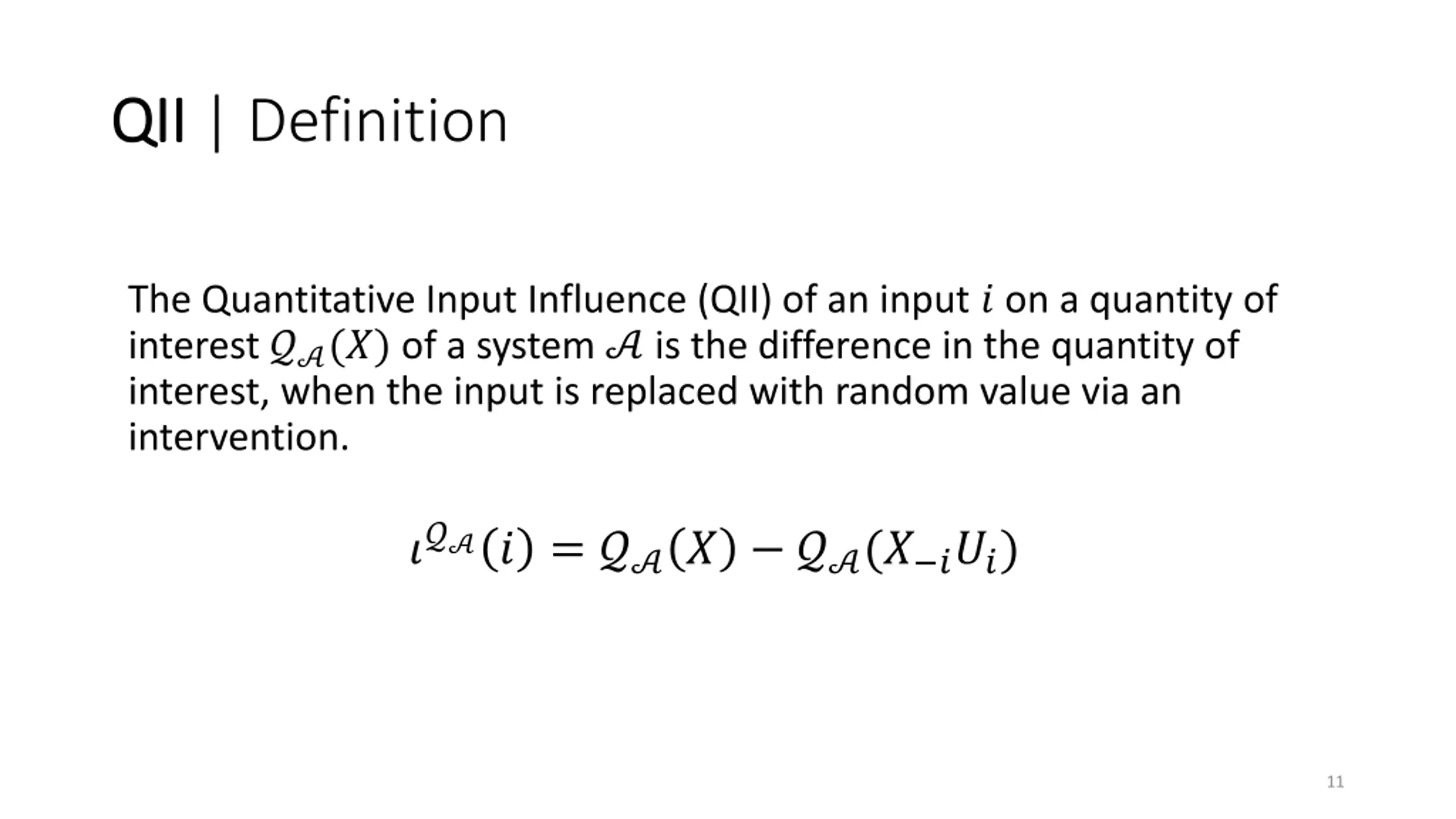 QII QII | Definition The Quantitative Input Influence (QII) of an input ? on a quantity of interest ??(?) of a system ? is the difference in the quantity of interest, when the input is replaced with random value via an intervention. ???? = ??? ??(? ???) 11