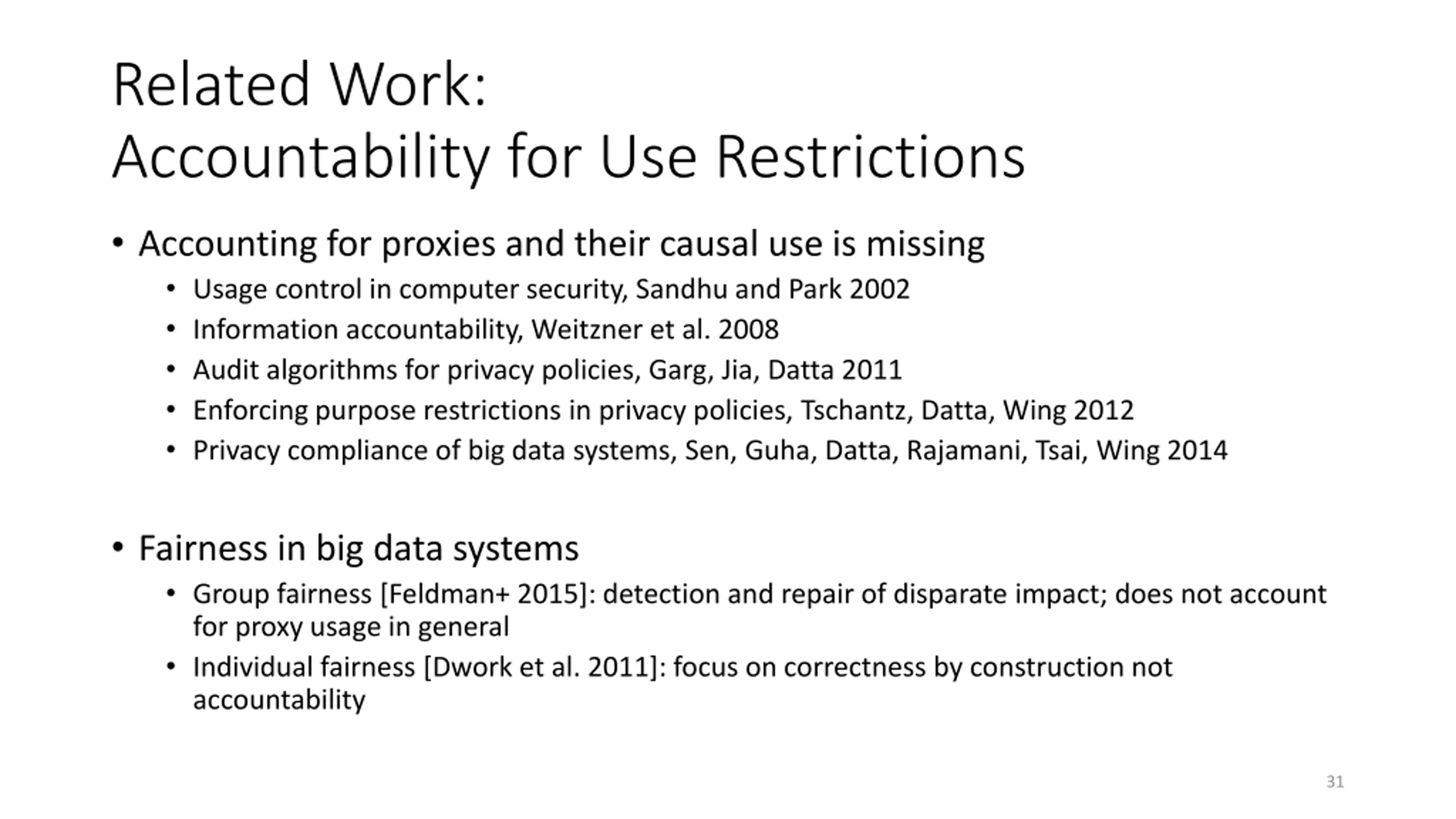 Related Work: Accountability for Use Restrictions Accounting for proxies and their causal use is missing Usage control in computer security, Sandhu and Park 2002 Information accountability, Weitzner et al. 2008 Audit algorithms for privacy policies, Garg, Jia, Datta 2011 Enforcing purpose restrictions in privacy policies, Tschantz, Datta, Wing 2012 Privacy compliance of big data systems, Sen, Guha, Datta, Rajamani, Tsai, Wing 2014 Fairness in big data systems Group fairness [Feldman+ 2015]: detection and repair of disparate impact; does not account for proxy usage in general Individual fairness [Dwork et al. 2011]: focus on correctness by construction not accountability 31