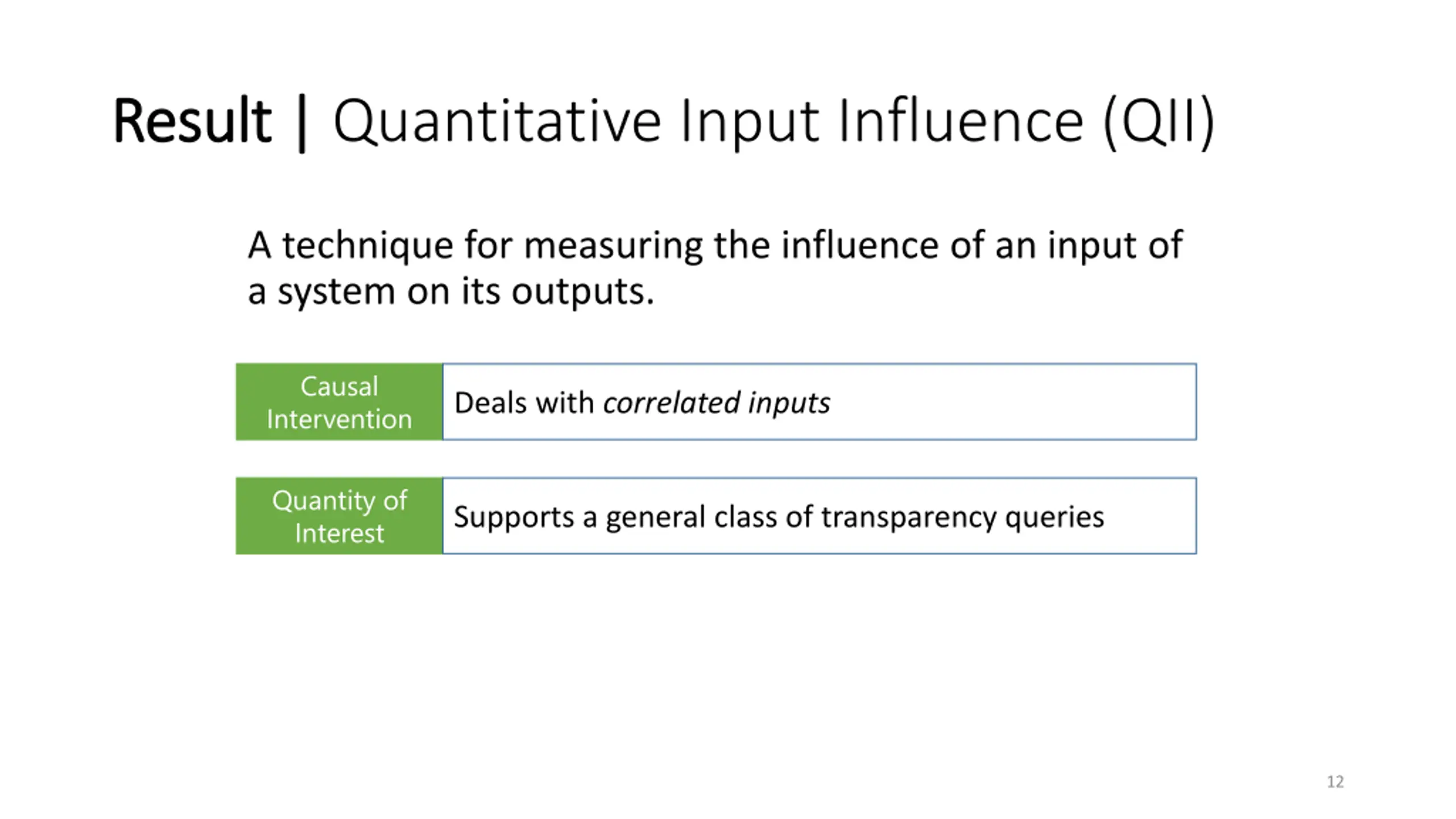 Result | Result | Quantitative Input Influence (QII) A technique for measuring the influence of an input of a system on its outputs. Causal Intervention Deals with correlated inputs Quantity of Interest Supports a general class of transparency queries 12
