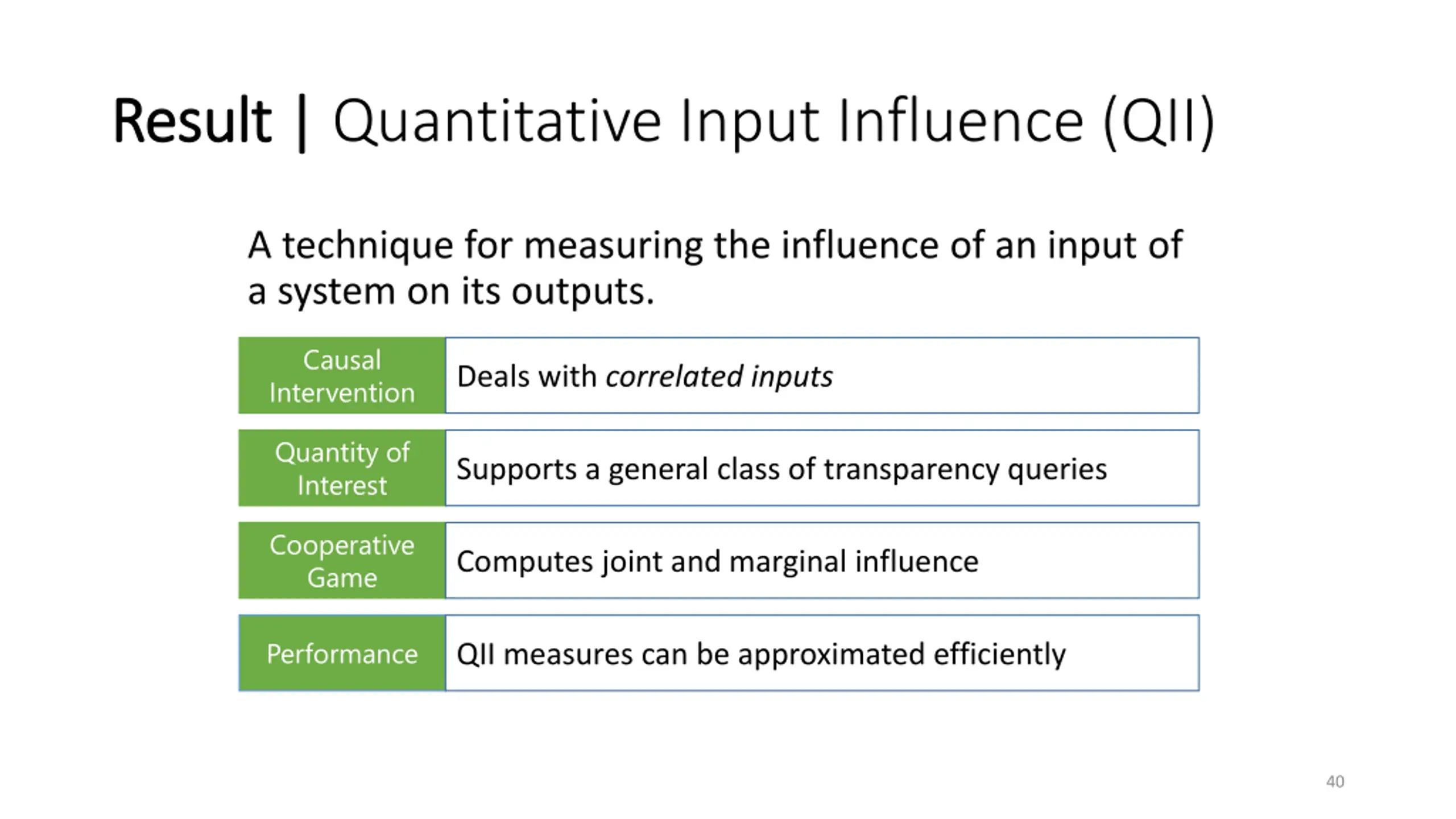Result | Result | Quantitative Input Influence (QII) A technique for measuring the influence of an input of a system on its outputs. Causal Intervention Deals with correlated inputs Quantity of Interest Supports a general class of transparency queries Cooperative Game Computes joint and marginal influence Performance QII measures can be approximated efficiently 40
