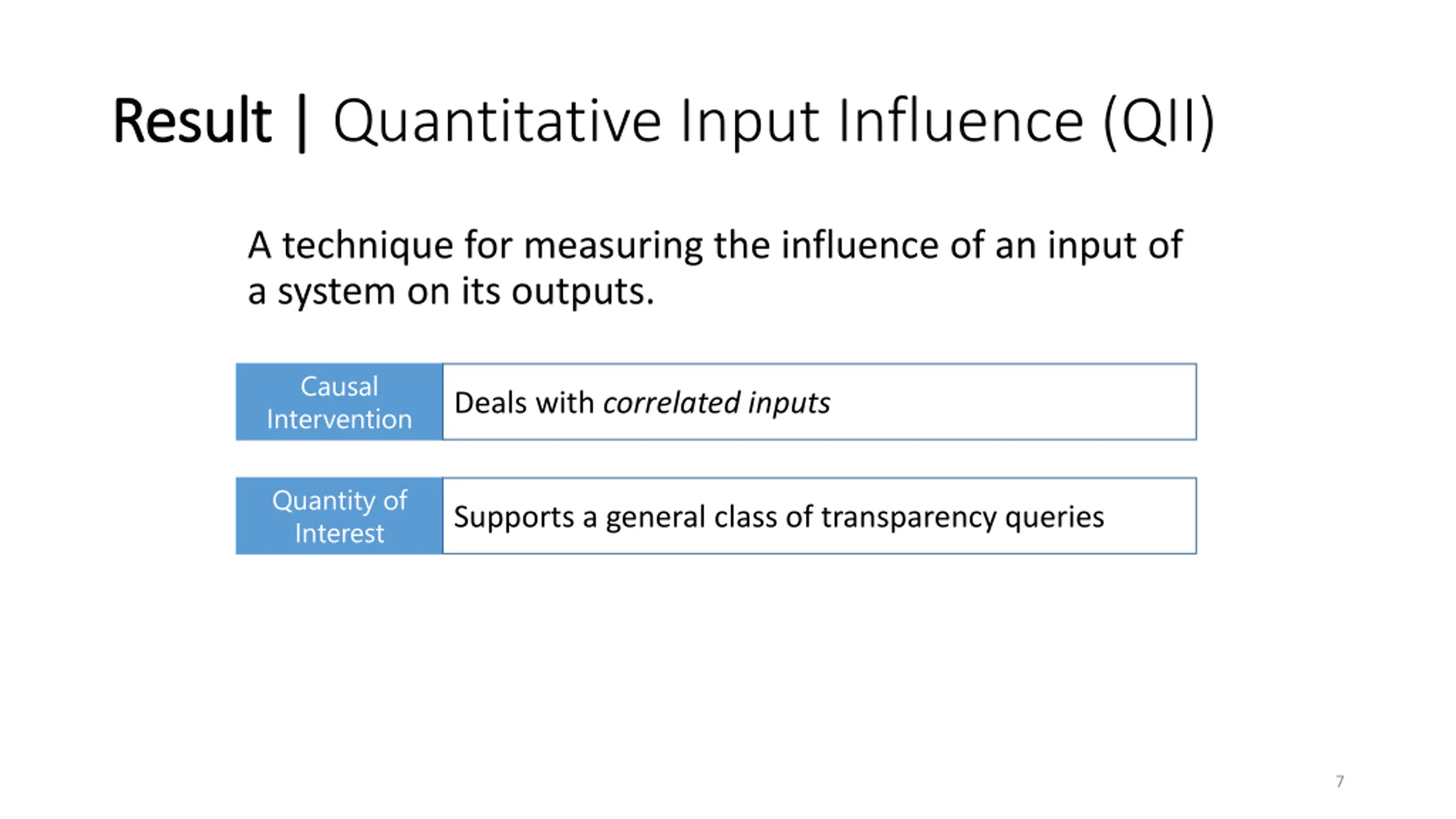 Result | Result | Quantitative Input Influence (QII) A technique for measuring the influence of an input of a system on its outputs. Causal Intervention Deals with correlated inputs Quantity of Interest Supports a general class of transparency queries 16
