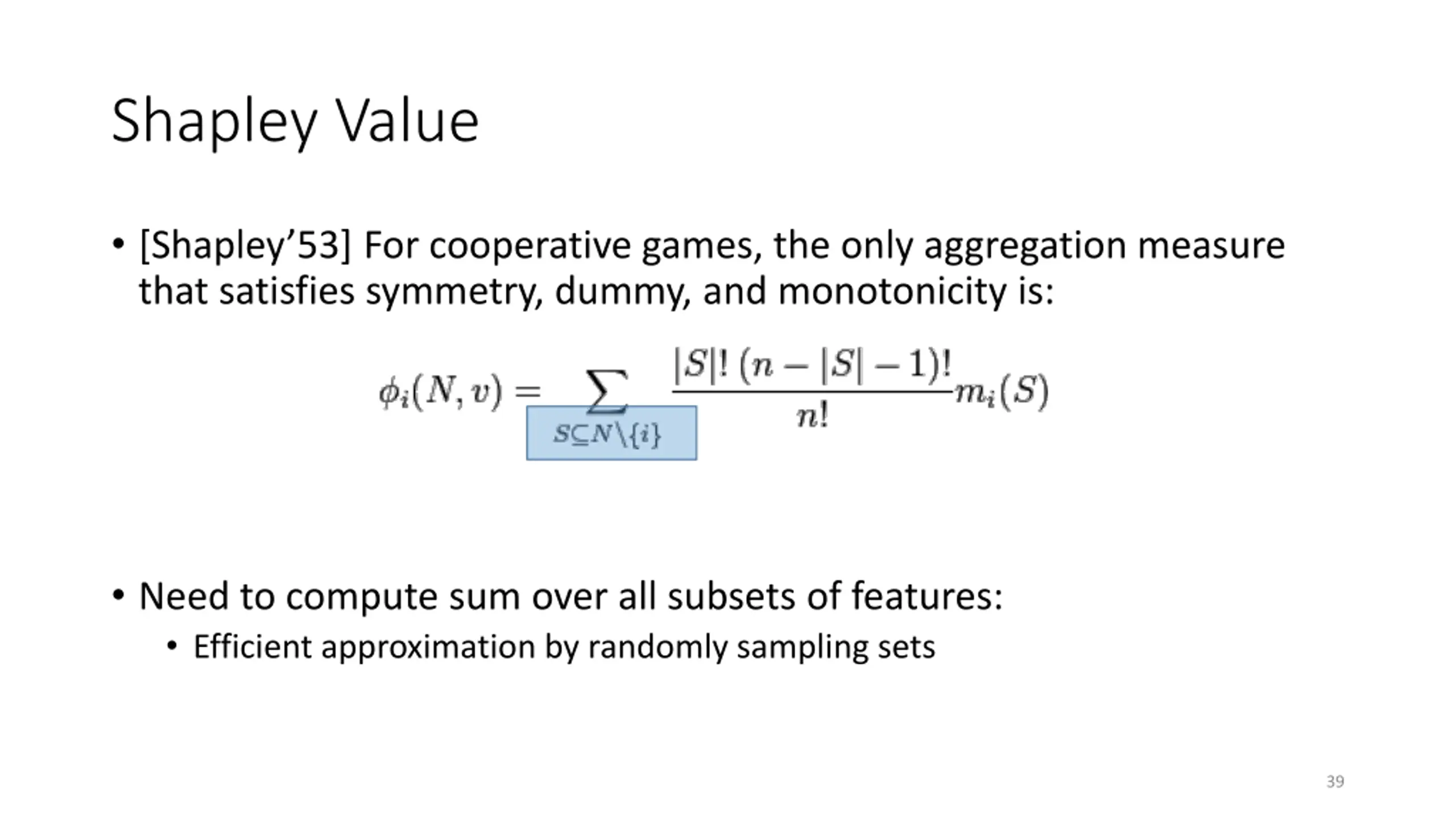 Shapley Value [Shapley 53] For cooperative games, the only aggregation measure that satisfies symmetry, dummy, and monotonicity is: Need to compute sum over all subsets of features: Efficient approximation by randomly sampling sets 39