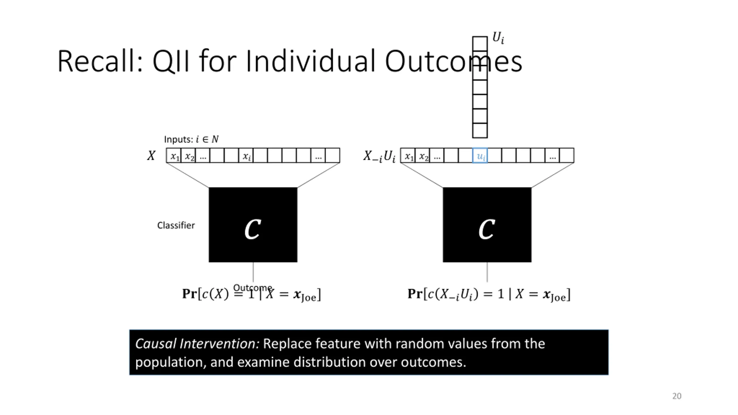 ?? Recall: QII for Individual Outcomes Inputs: ? ? ? ? ??? ?1?2 ?? ?1?2 ?? ?? ? ? Classifier Outcome ?? ? ? = 1 ? = ?Joe] ?? ? ? ??? = 1 ? = ?Joe] Causal Intervention: Replace feature with random values from the population, and examine distribution over outcomes. 20