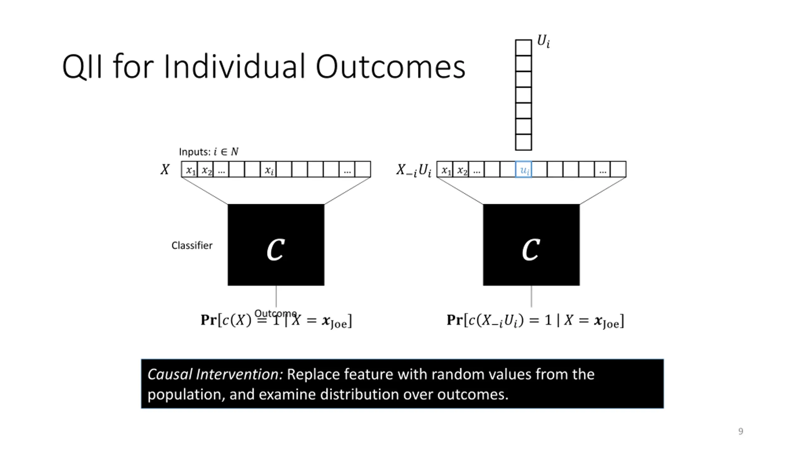 ?? QII for Individual Outcomes Inputs: ? ? ? ? ??? ?1?2 ?? ?1?2 ?? ?? ? ? Classifier Outcome ?? ? ? = 1 ? = ?Joe] ?? ? ? ??? = 1 ? = ?Joe] Causal Intervention: Replace feature with random values from the population, and examine distribution over outcomes. 9