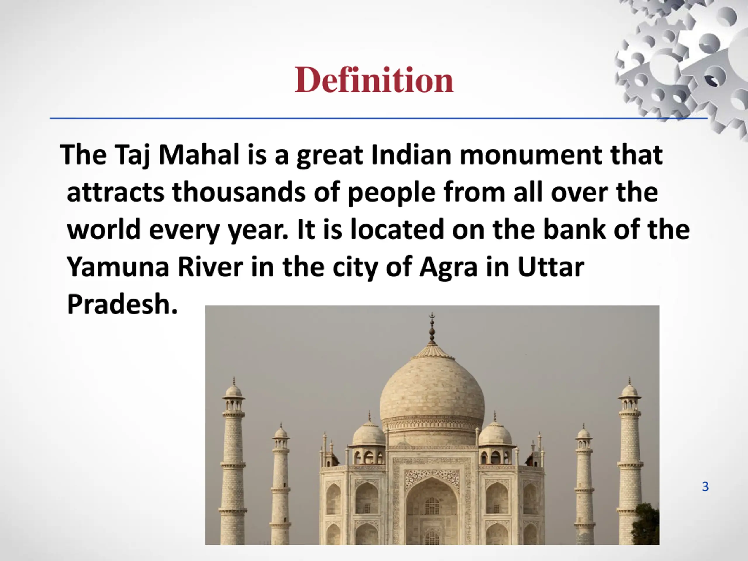 Definition The Taj Mahal is a great Indian monument that attracts thousands of people from all over the world every year. It is located on the bank of the Yamuna River in the city of Agra in Uttar Pradesh. 3