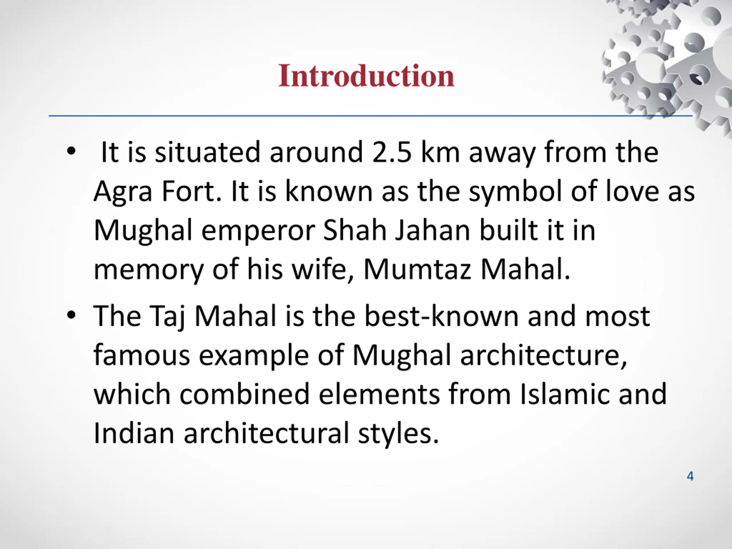 Introduction It is situated around 2.5 km away from the Agra Fort. It is known as the symbol of love as Mughal emperor Shah Jahan built it in memory of his wife, Mumtaz Mahal. The Taj Mahal is the best-known and most famous example of Mughal architecture, which combined elements from Islamic and Indian architectural styles. 4