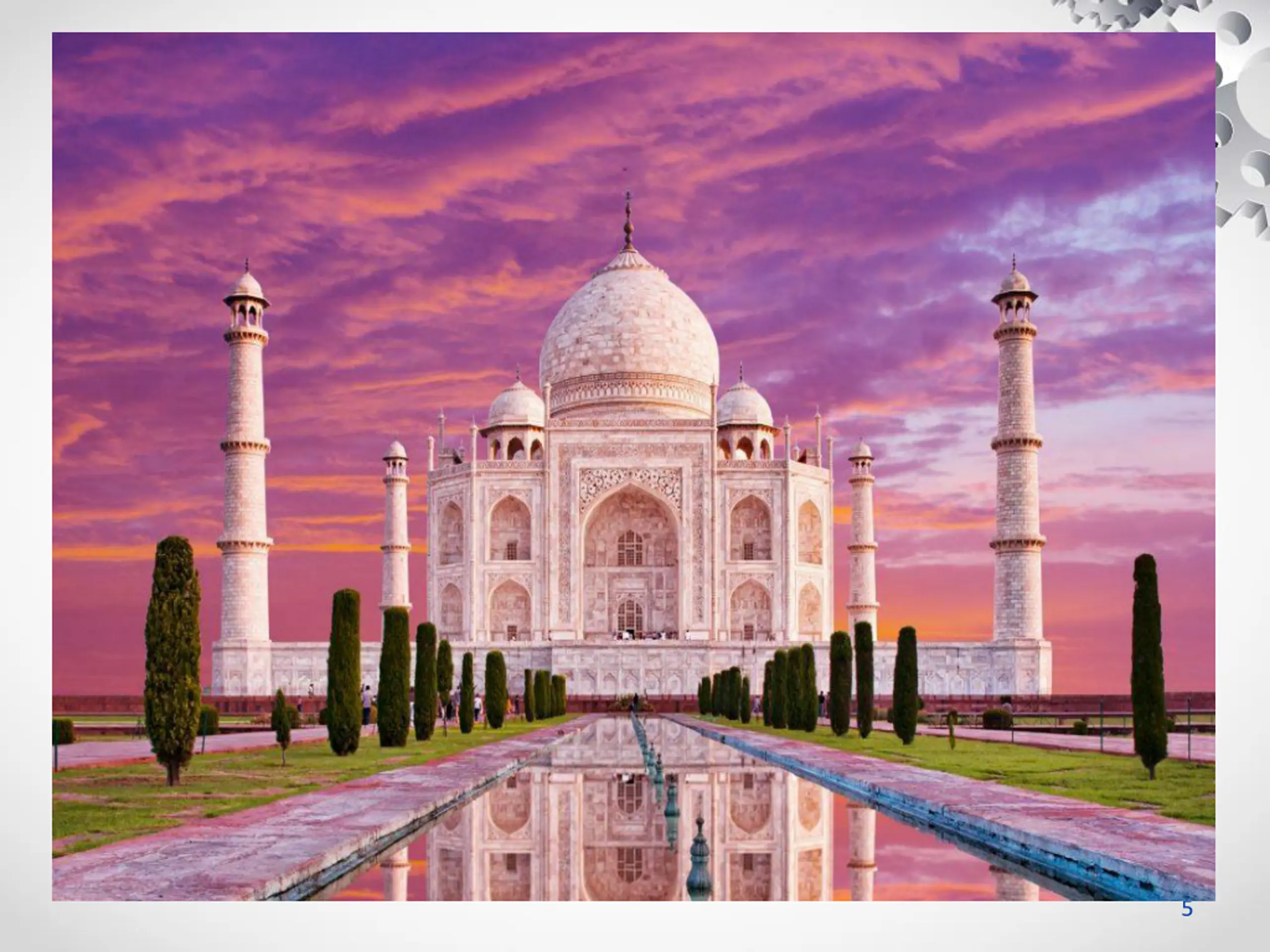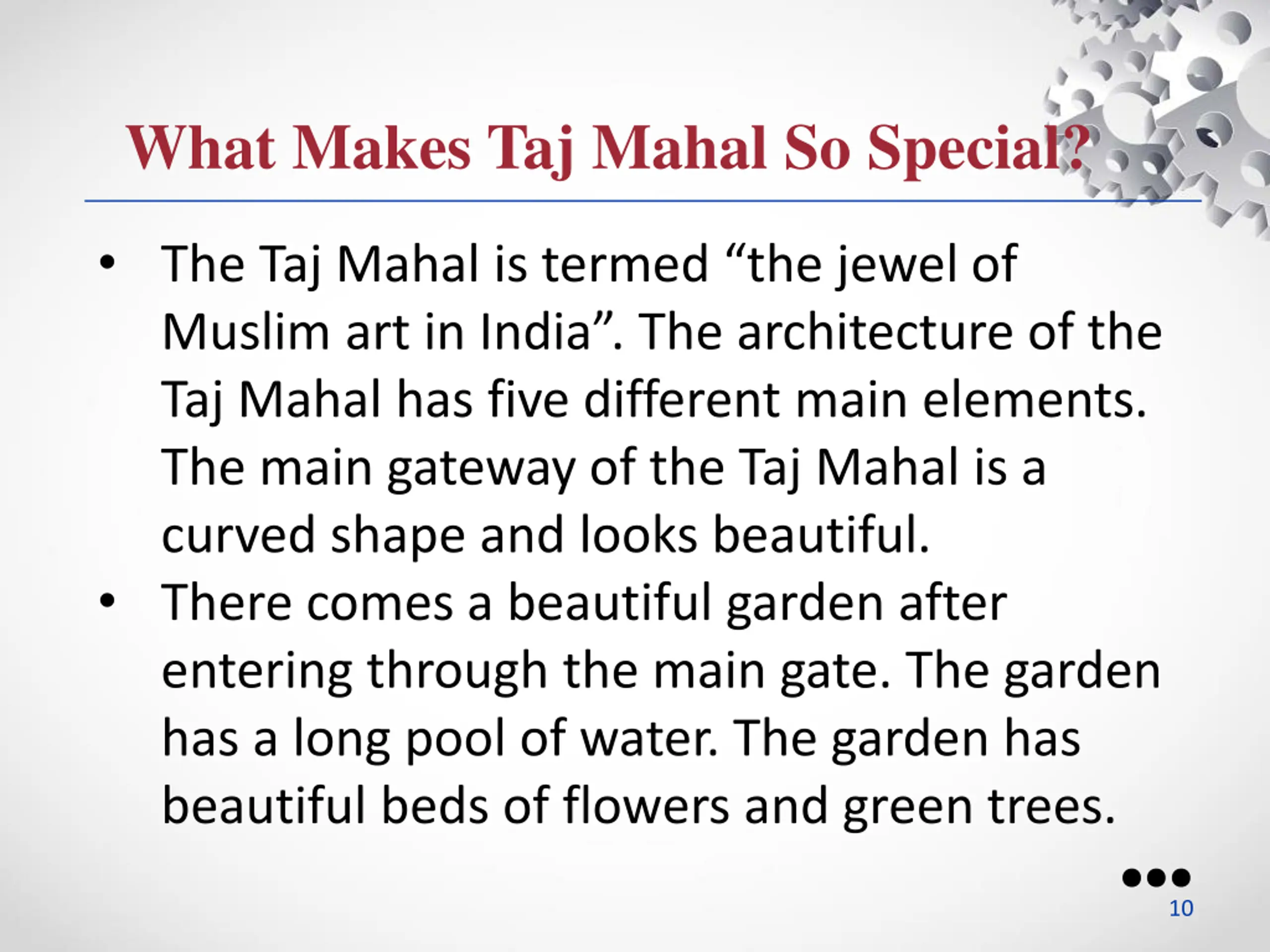 What Makes Taj Mahal So Special? The Taj Mahal is termed the jewel of Muslim art in India . The architecture of the Taj Mahal has five different main elements. The main gateway of the Taj Mahal is a curved shape and looks beautiful. There comes a beautiful garden after entering through the main gate. The garden has a long pool of water. The garden has beautiful beds of flowers and green trees. 10
