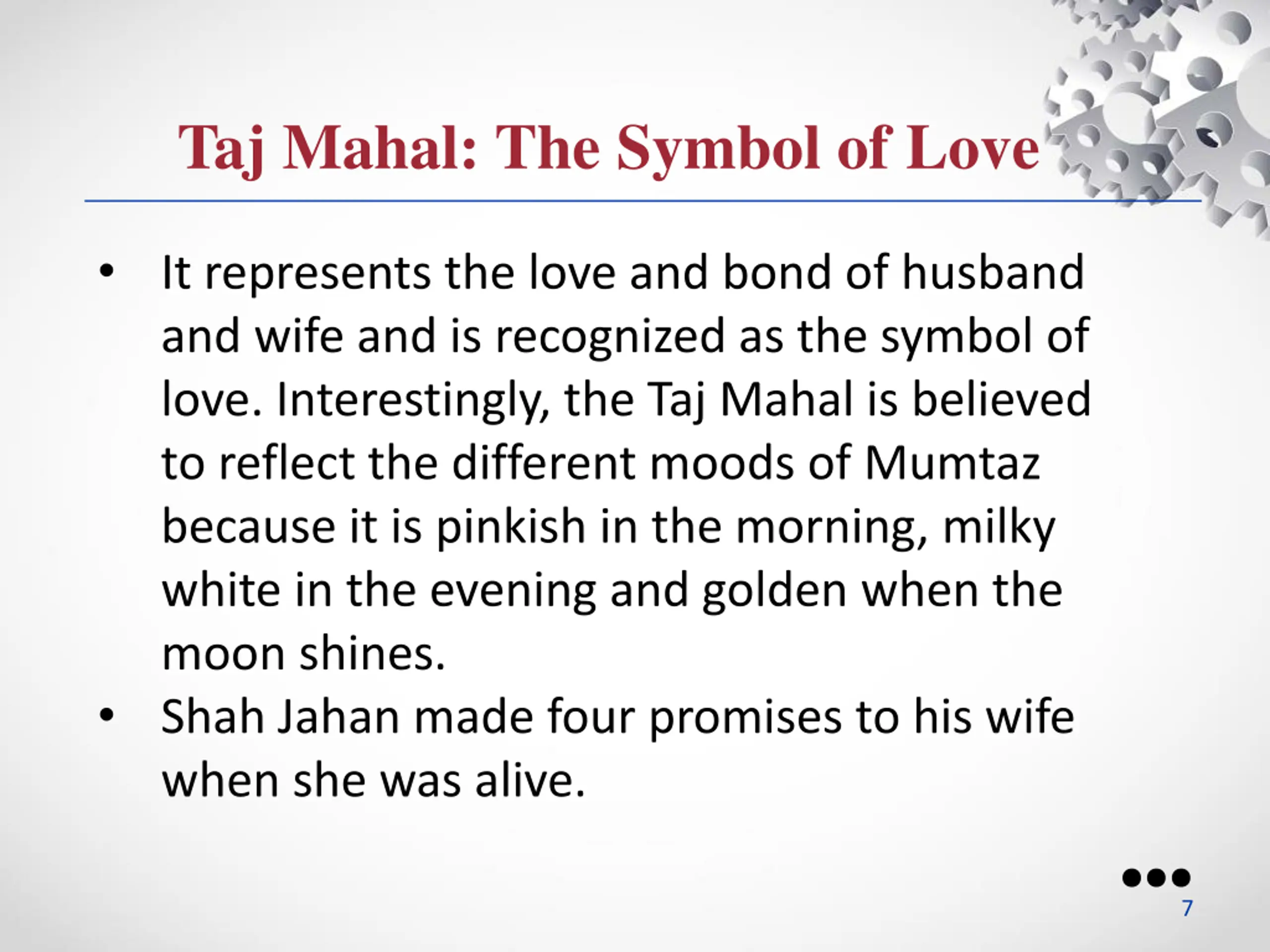 Taj Mahal: The Symbol of Love It represents the love and bond of husband and wife and is recognized as the symbol of love. Interestingly, the Taj Mahal is believed to reflect the different moods of Mumtaz because it is pinkish in the morning, milky white in the evening and golden when the moon shines. Shah Jahan made four promises to his wife when she was alive. 7