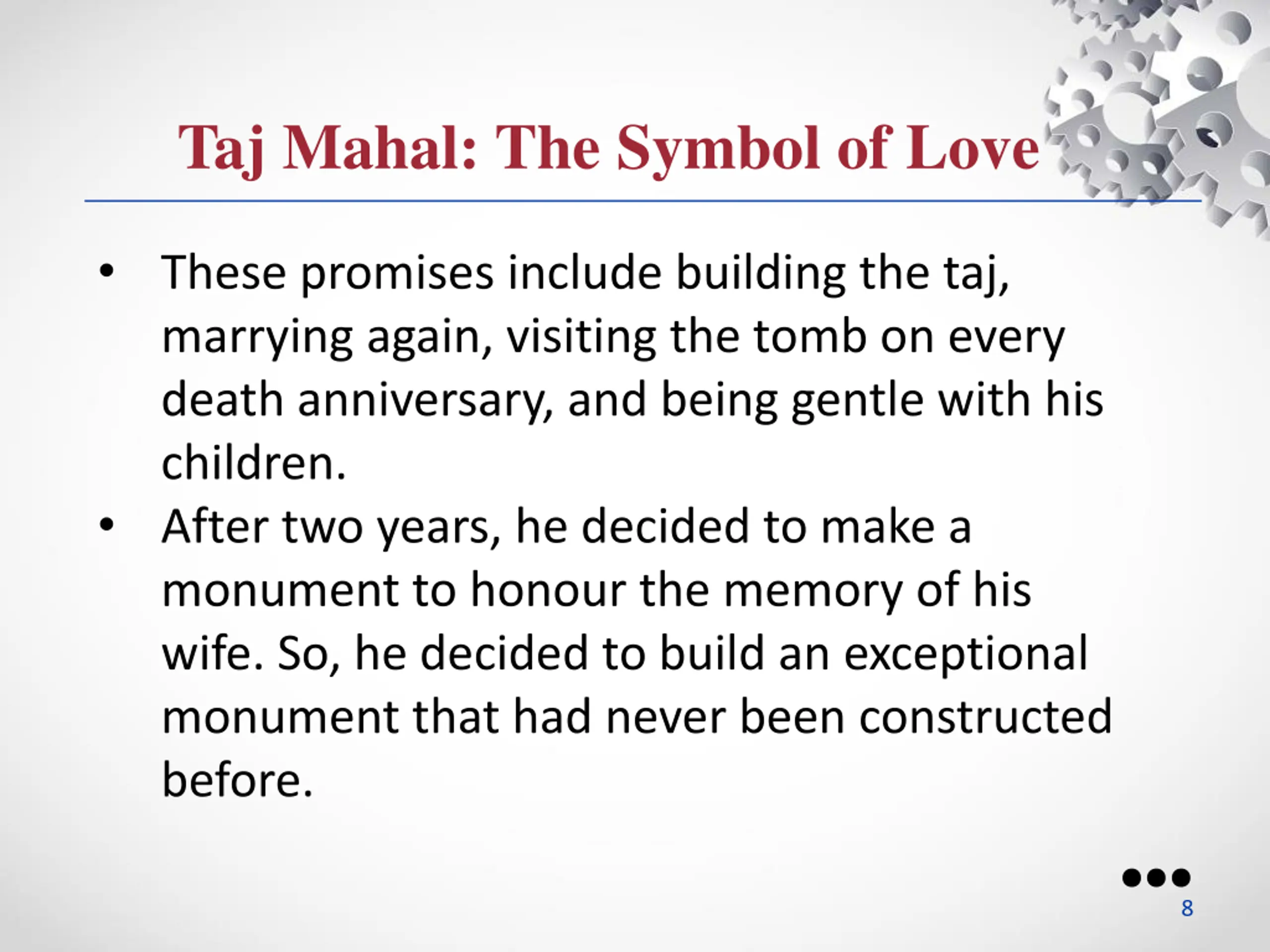 Taj Mahal: The Symbol of Love These promises include building the taj, marrying again, visiting the tomb on every death anniversary, and being gentle with his children. After two years, he decided to make a monument to honour the memory of his wife. So, he decided to build an exceptional monument that had never been constructed before. 8