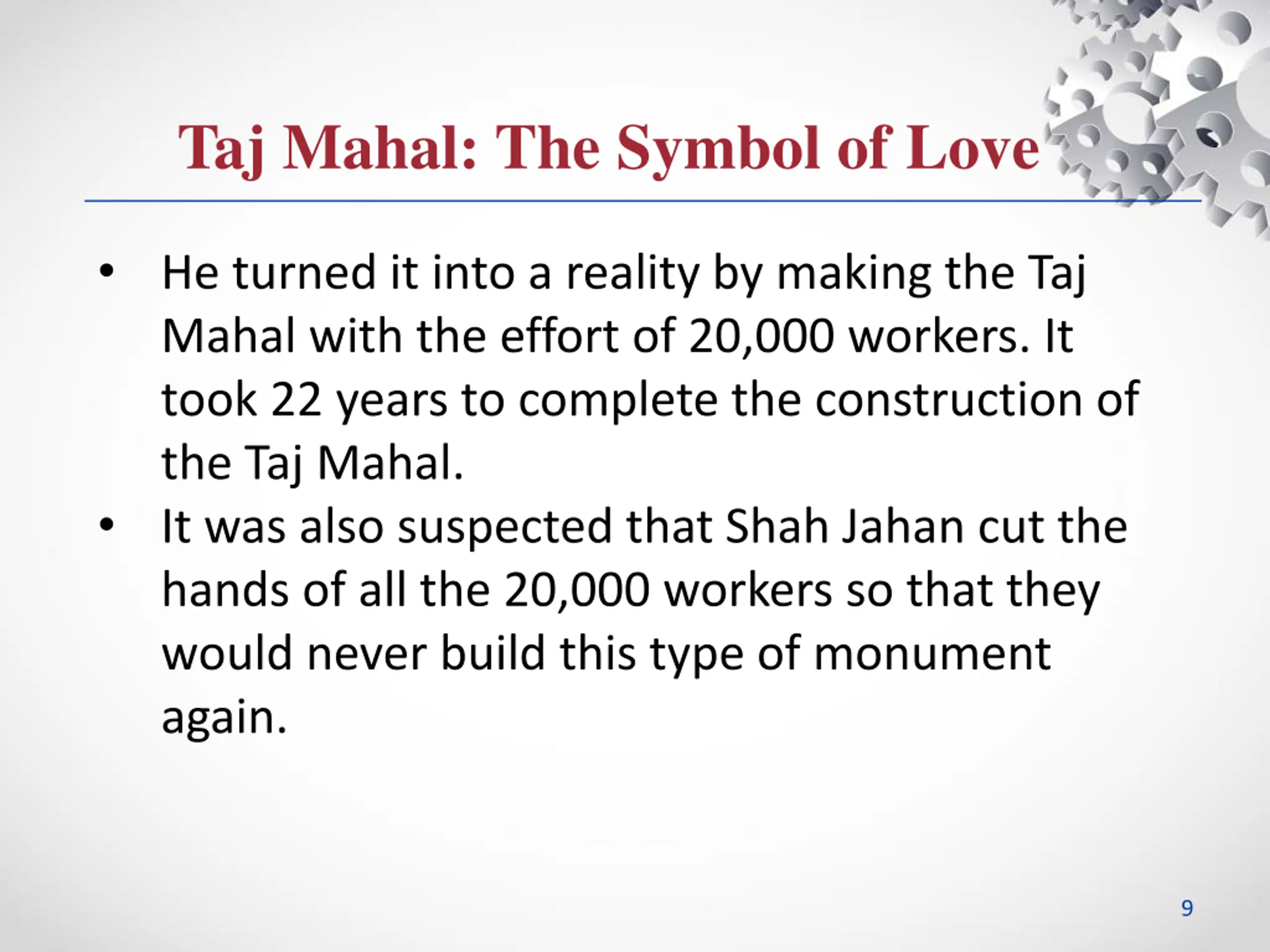 Taj Mahal: The Symbol of Love He turned it into a reality by making the Taj Mahal with the effort of 20,000 workers. It took 22 years to complete the construction of the Taj Mahal. It was also suspected that Shah Jahan cut the hands of all the 20,000 workers so that they would never build this type of monument again. 9