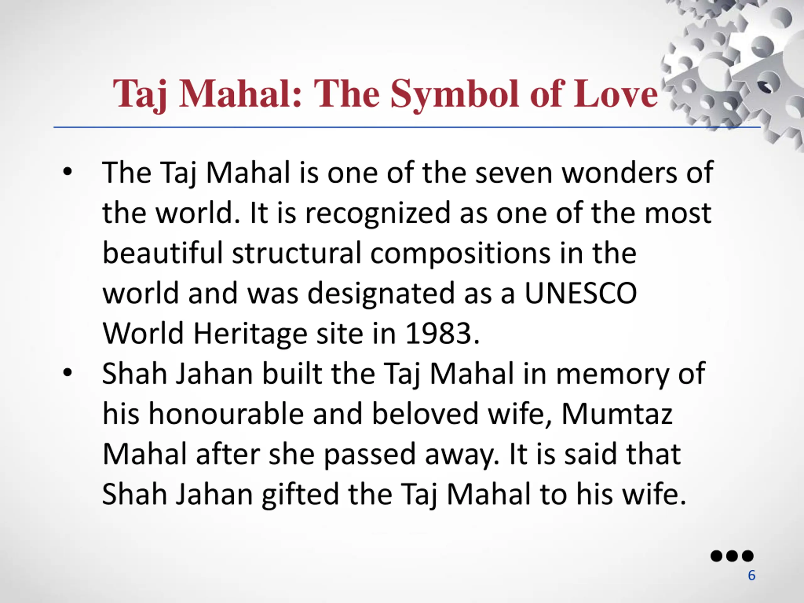 Taj Mahal: The Symbol of Love The Taj Mahal is one of the seven wonders of the world. It is recognized as one of the most beautiful structural compositions in the world and was designated as a UNESCO World Heritage site in 1983. Shah Jahan built the Taj Mahal in memory of his honourable and beloved wife, Mumtaz Mahal after she passed away. It is said that Shah Jahan gifted the Taj Mahal to his wife. 6