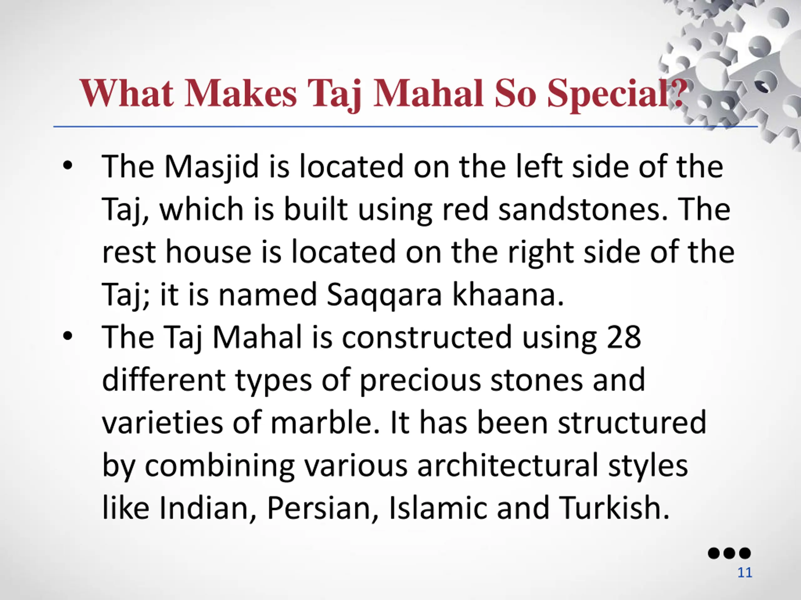 What Makes Taj Mahal So Special? The Masjid is located on the left side of the Taj, which is built using red sandstones. The rest house is located on the right side of the Taj; it is named Saqqara khaana. The Taj Mahal is constructed using 28 different types of precious stones and varieties of marble. It has been structured by combining various architectural styles like Indian, Persian, Islamic and Turkish. 11