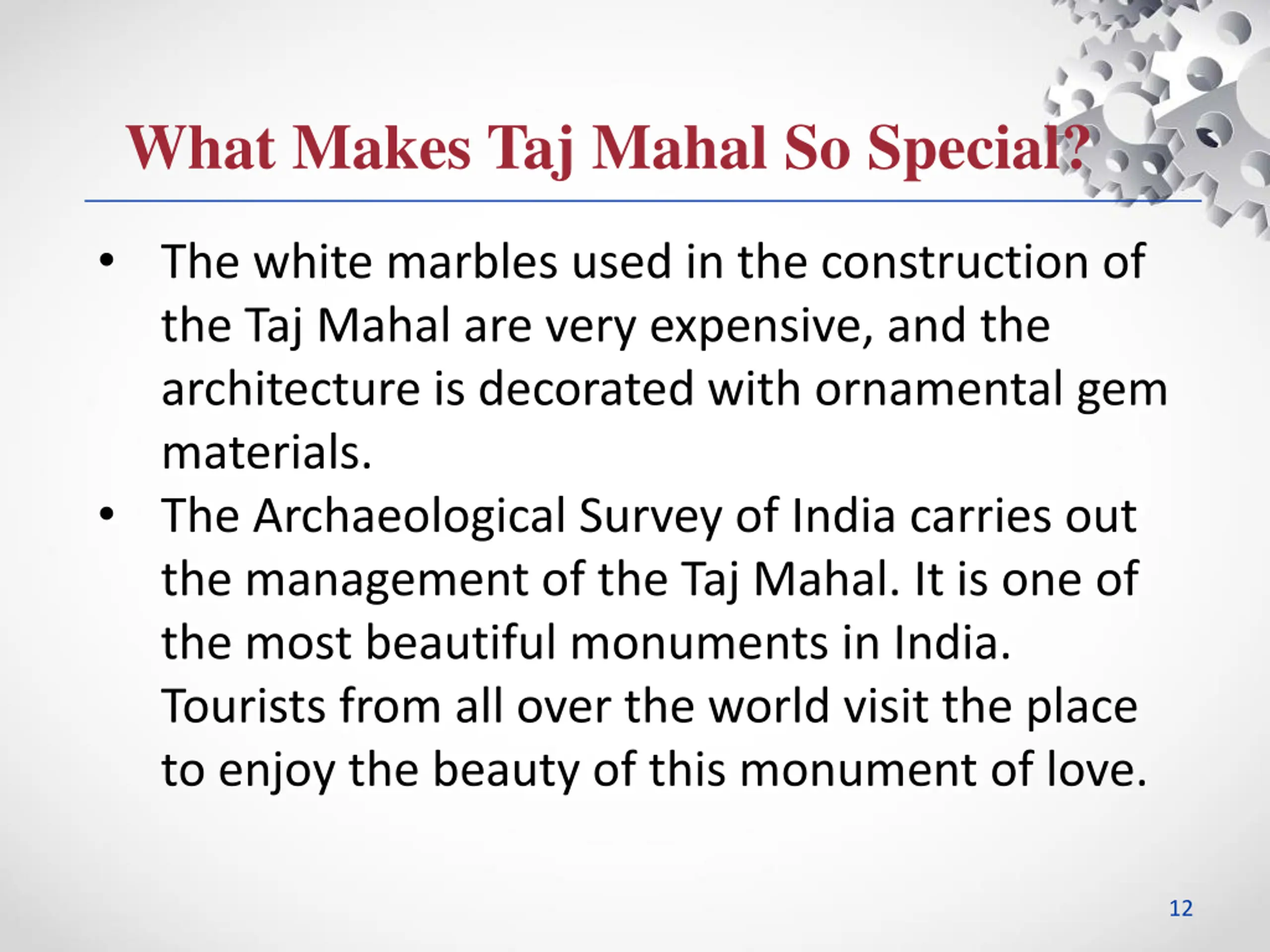 What Makes Taj Mahal So Special? The white marbles used in the construction of the Taj Mahal are very expensive, and the architecture is decorated with ornamental gem materials. The Archaeological Survey of India carries out the management of the Taj Mahal. It is one of the most beautiful monuments in India. Tourists from all over the world visit the place to enjoy the beauty of this monument of love. 12