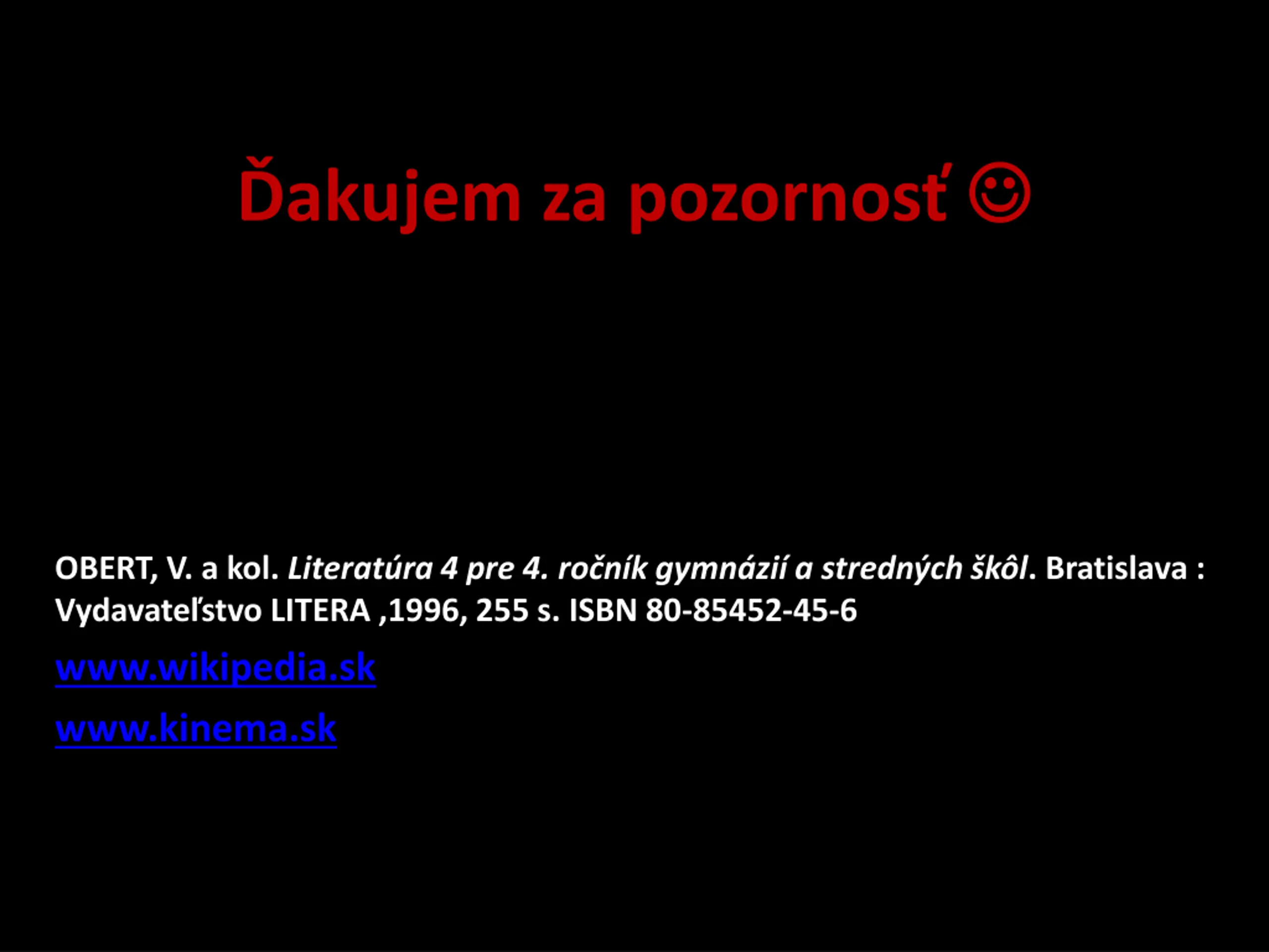 akujem za pozornos OBERT, V. a kol. Literat ra 4 pre 4. ro n k gymn zi a stredn ch k l. Bratislava : Vydavate stvo LITERA ,1996, 255 s. ISBN 80-85452-45-6 www.wikipedia.sk www.kinema.sk