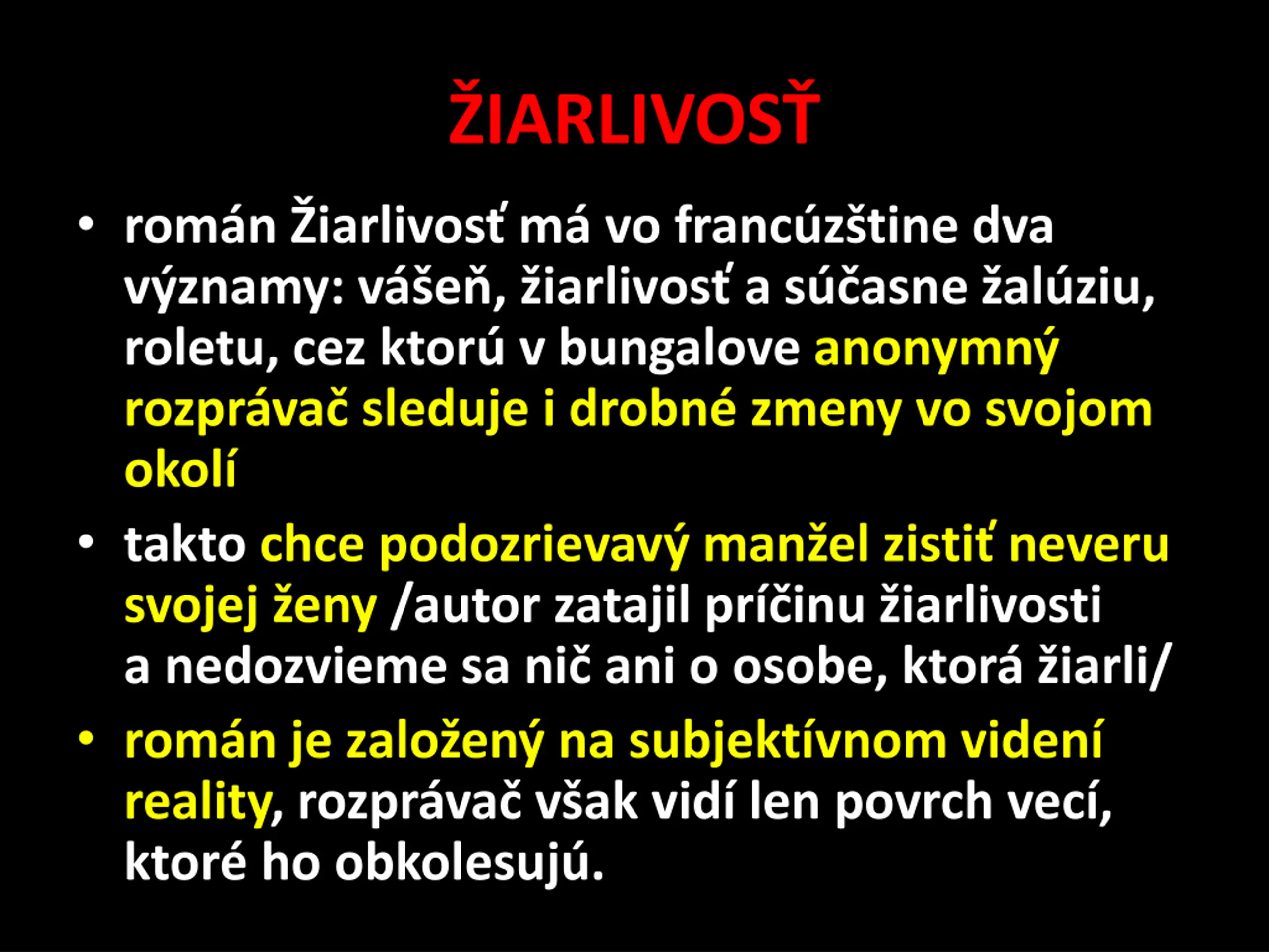 IARLIVOS rom n iarlivos m vo franc z tine dva v znamy: v e , iarlivos a s asne al ziu, roletu, cez ktor v bungalove anonymn rozpr va sleduje i drobn zmeny vo svojom okol takto chce podozrievav man el zisti neveru svojej eny /autor zatajil pr inu iarlivosti a nedozvieme sa ni ani o osobe, ktor iarli/ rom n je zalo en na subjekt vnom viden reality, rozpr va v ak vid len povrch vec , ktor ho obkolesuj .