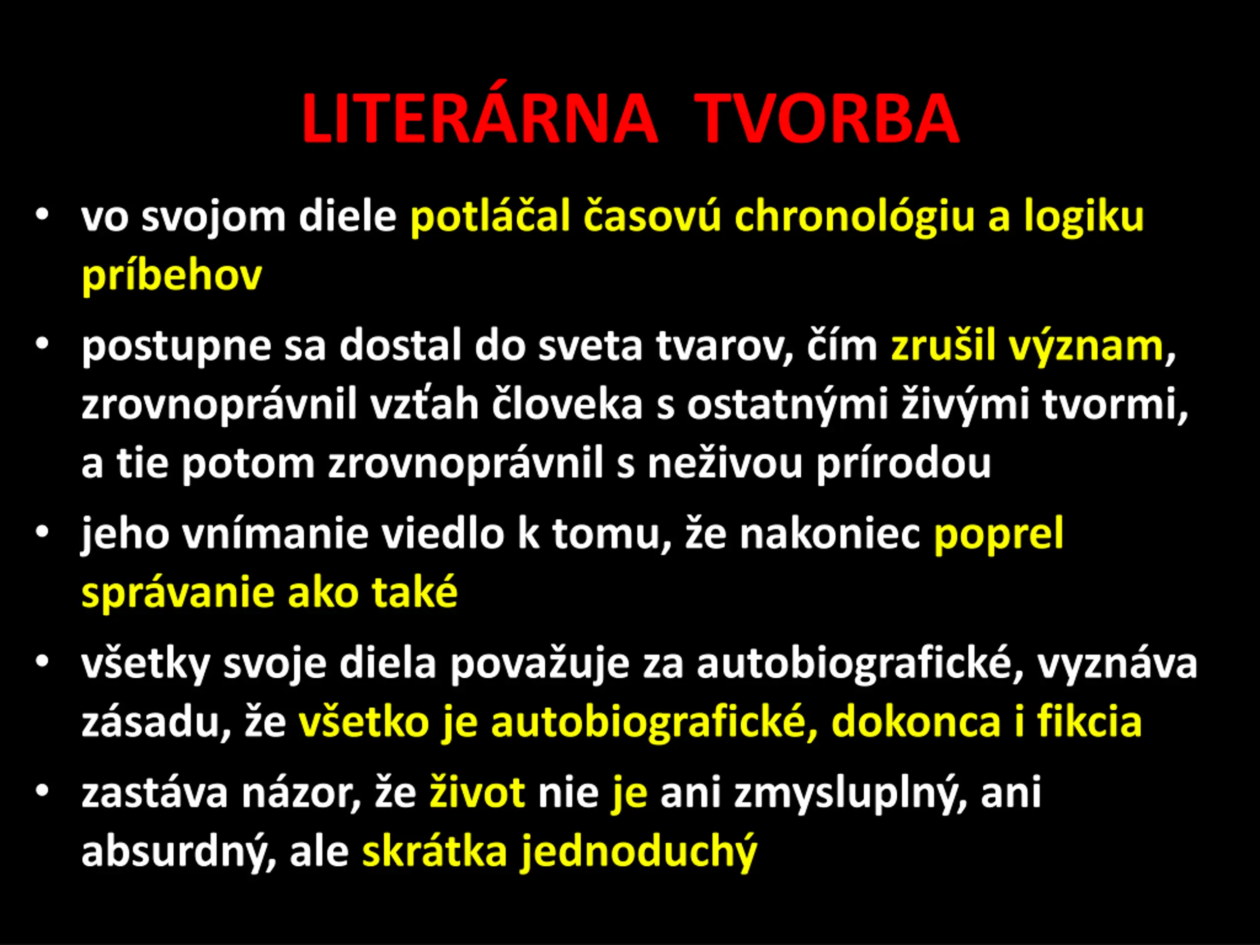 LITERRNA TVORBA vo svojom diele potl al asov chronol giu a logiku pr behov postupne sa dostal do sveta tvarov, m zru il v znam, zrovnopr vnil vz ah loveka s ostatn mi iv mi tvormi, a tie potom zrovnopr vnil s ne ivou pr rodou jeho vn manie viedlo k tomu, e nakoniec poprel spr vanie ako tak v etky svoje diela pova uje za autobiografick , vyzn va z sadu, e v etko je autobiografick , dokonca i fikcia zast va n zor, e ivot nie je ani zmyslupln , ani absurdn , ale skr tka jednoduch