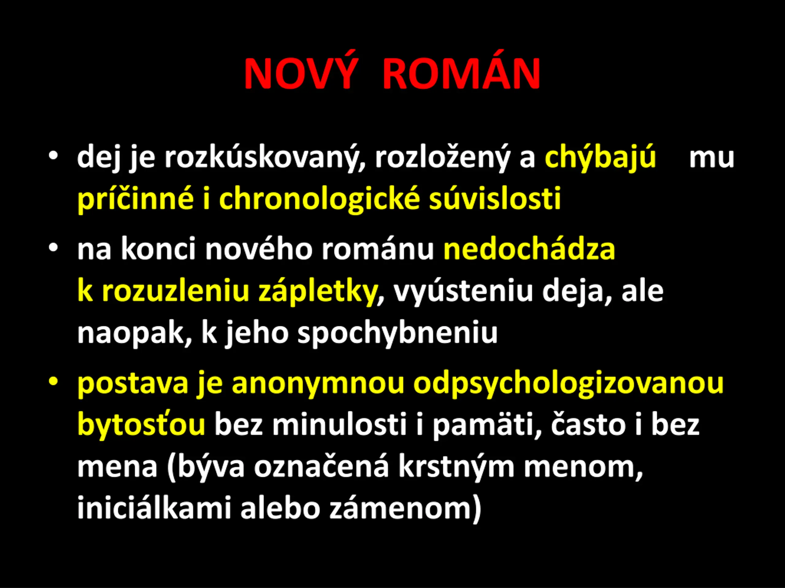NOV ROMN predstavitelia nov ho rom nu odmietali klasick pr zu, tzn. fabulu, a epick ho hrdinu p sali racion lne, bez uplatnenia fant zie vyzdvihovali v znam dial gov, preto e p sobia na psychiku partnera, hovoriaceho odmietali vn torn monol g uprednost ovali formu a t l pred obsahom vniesli do literat ry kamery tradi n kompoz ciu vyjadruj psychiku typ rozpr va a oka