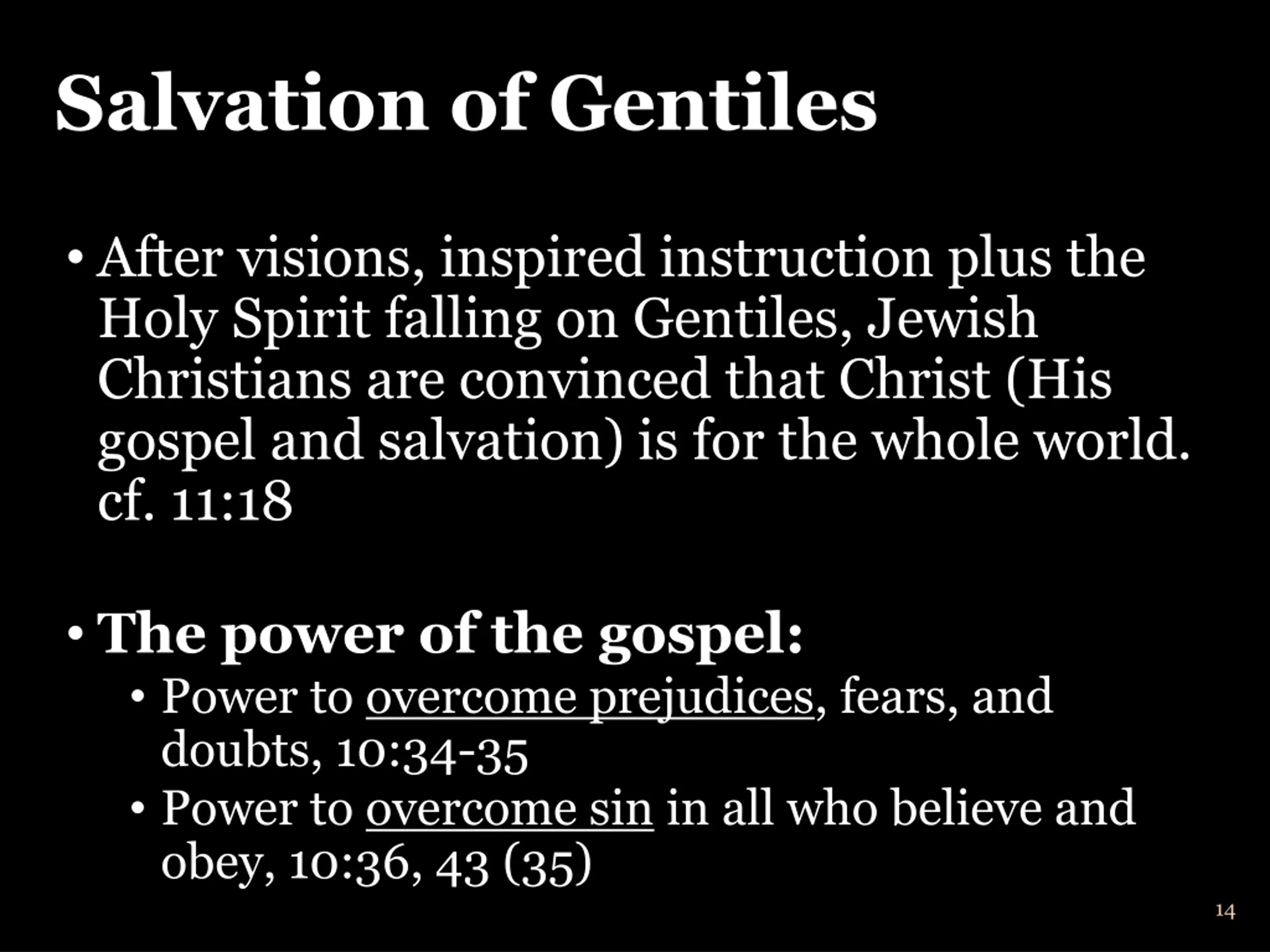 Salvation of Gentiles After visions, inspired instruction plus the Holy Spirit falling on Gentiles, Jewish Christians are convinced that Christ (His gospel and salvation) is for the whole world. cf. 11:18 The power of the gospel: Power to overcome prejudices, fears, and doubts, 10:34-35 Power to overcome sin in all who believe and obey, 10:36, 43 (35) 14