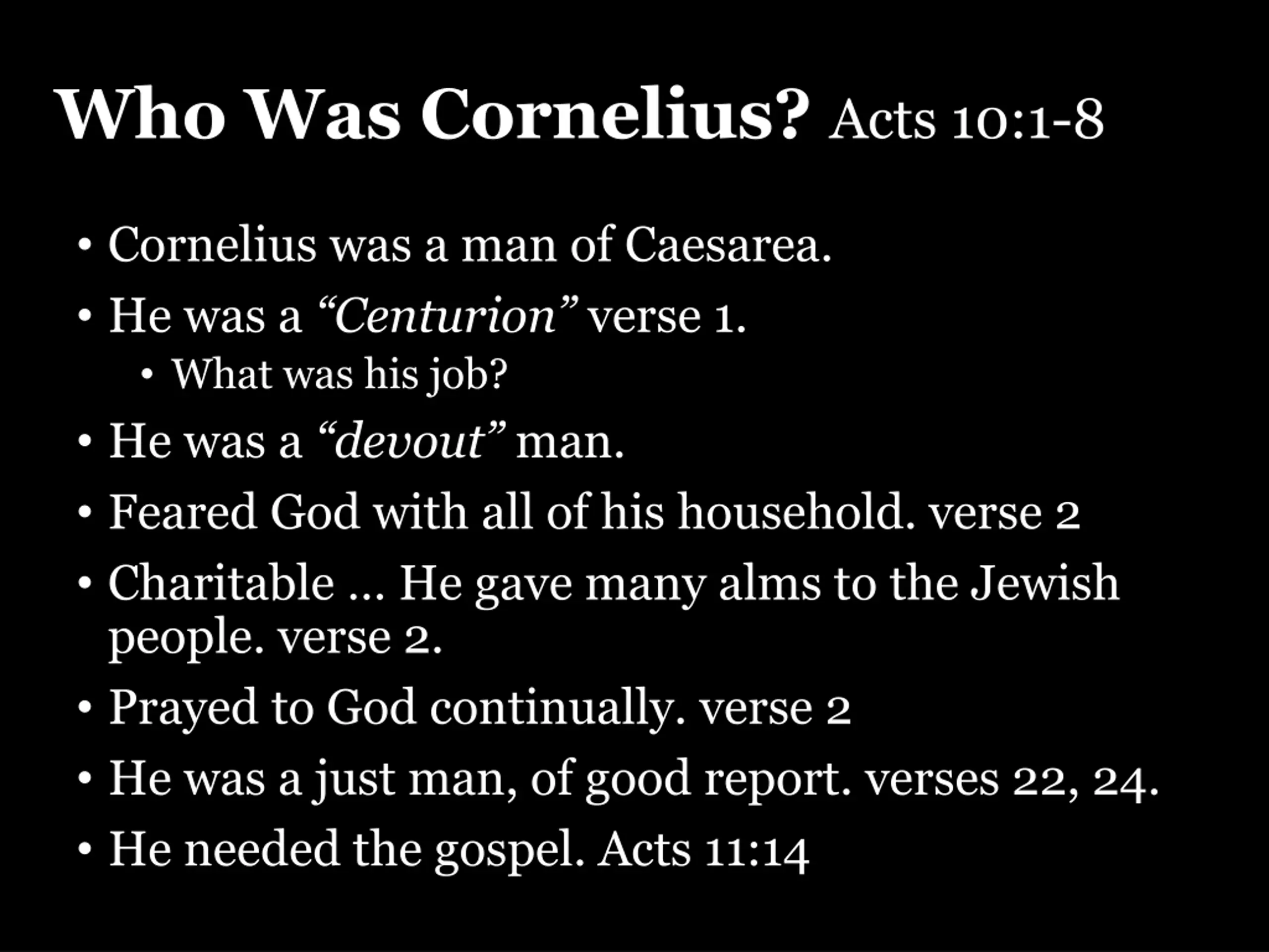 Who Was Cornelius? Acts 10:1-8 Cornelius was a man of Caesarea. He was a Centurion verse 1. What was his job? He was a devout man. Feared God with all of his household. verse 2 Charitable He gave many alms to the Jewish people. verse 2. Prayed to God continually. verse 2 He was a just man, of good report. verses 22, 24. He needed the gospel. Acts 11:14