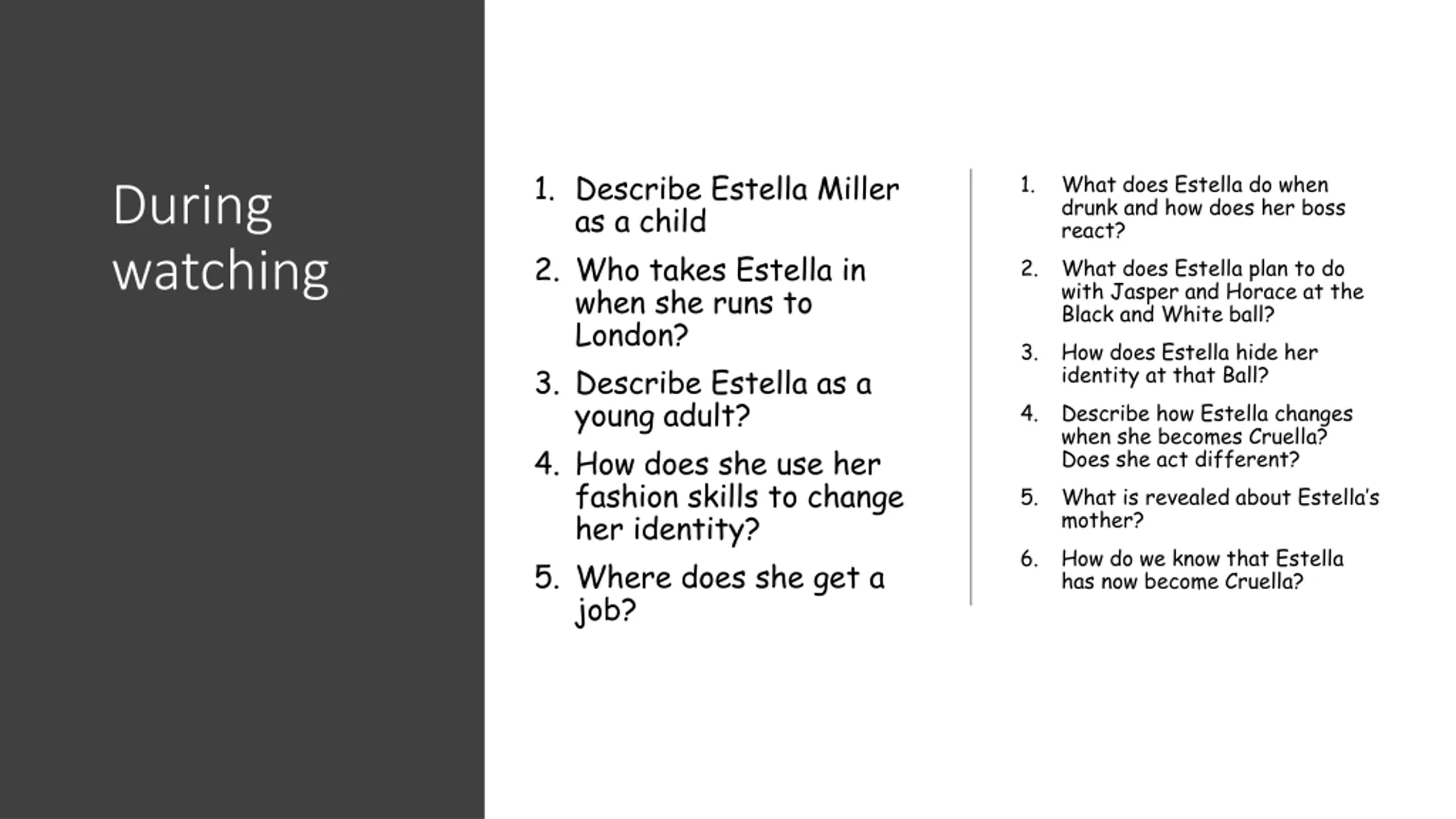 1. Describe Estella Miller as a child 2. Who takes Estella in when she runs to London? 3. Describe Estella as a young adult? 4. How does she use her fashion skills to change her identity? 5. Where does she get a job? 1. What does Estella do when drunk and how does her boss react? What does Estella plan to do with Jasper and Horace at the Black and White ball? How does Estella hide her identity at that Ball? Describe how Estella changes when she becomes Cruella? Does she act different? What is revealed about Estella s mother? How do we know that Estella has now become Cruella? During watching 2. 3. 4. 5. 6.