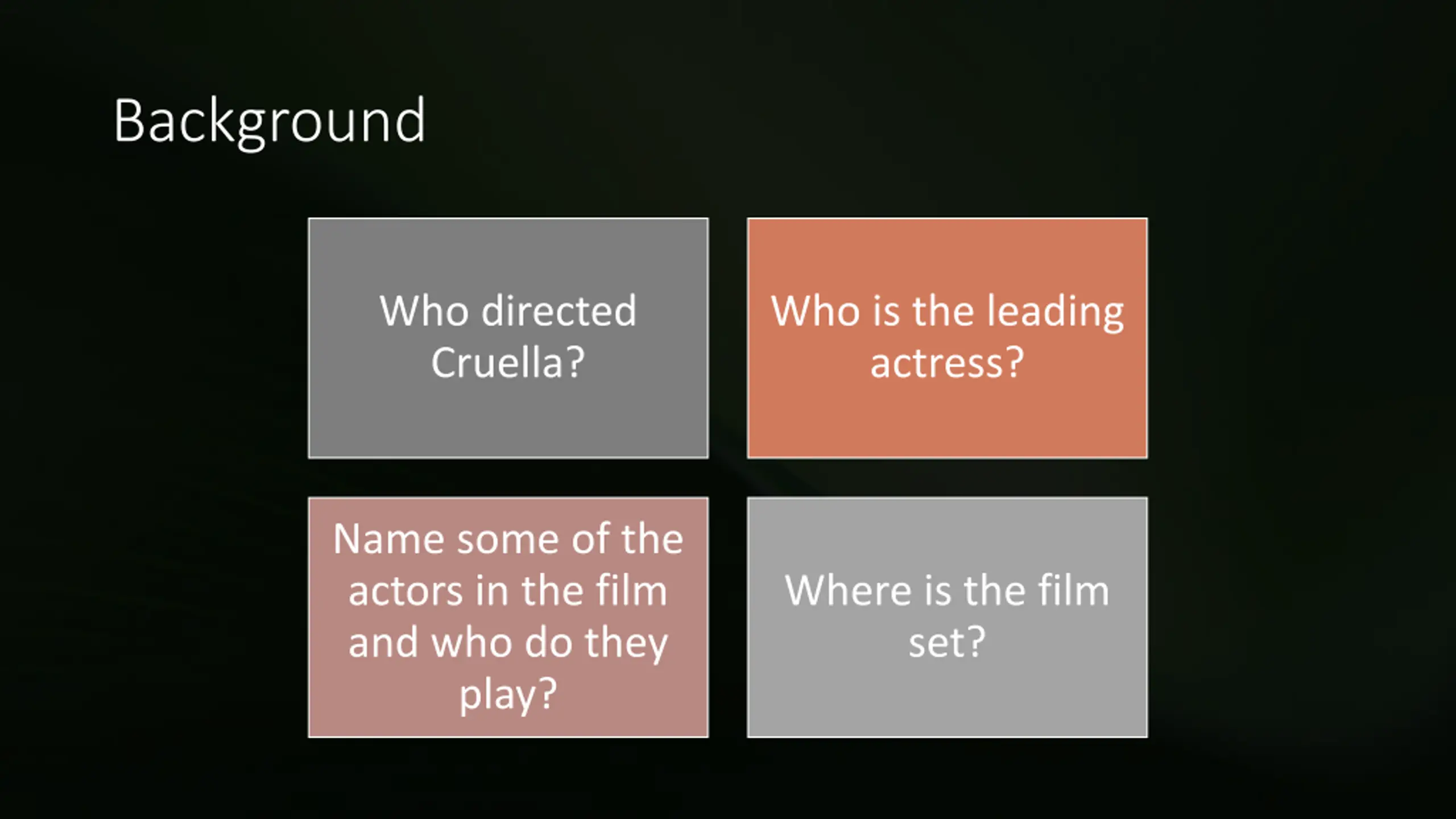 Background Who directed Cruella? Who is the leading actress? Name some of the actors in the film and who do they play? Where is the film set?