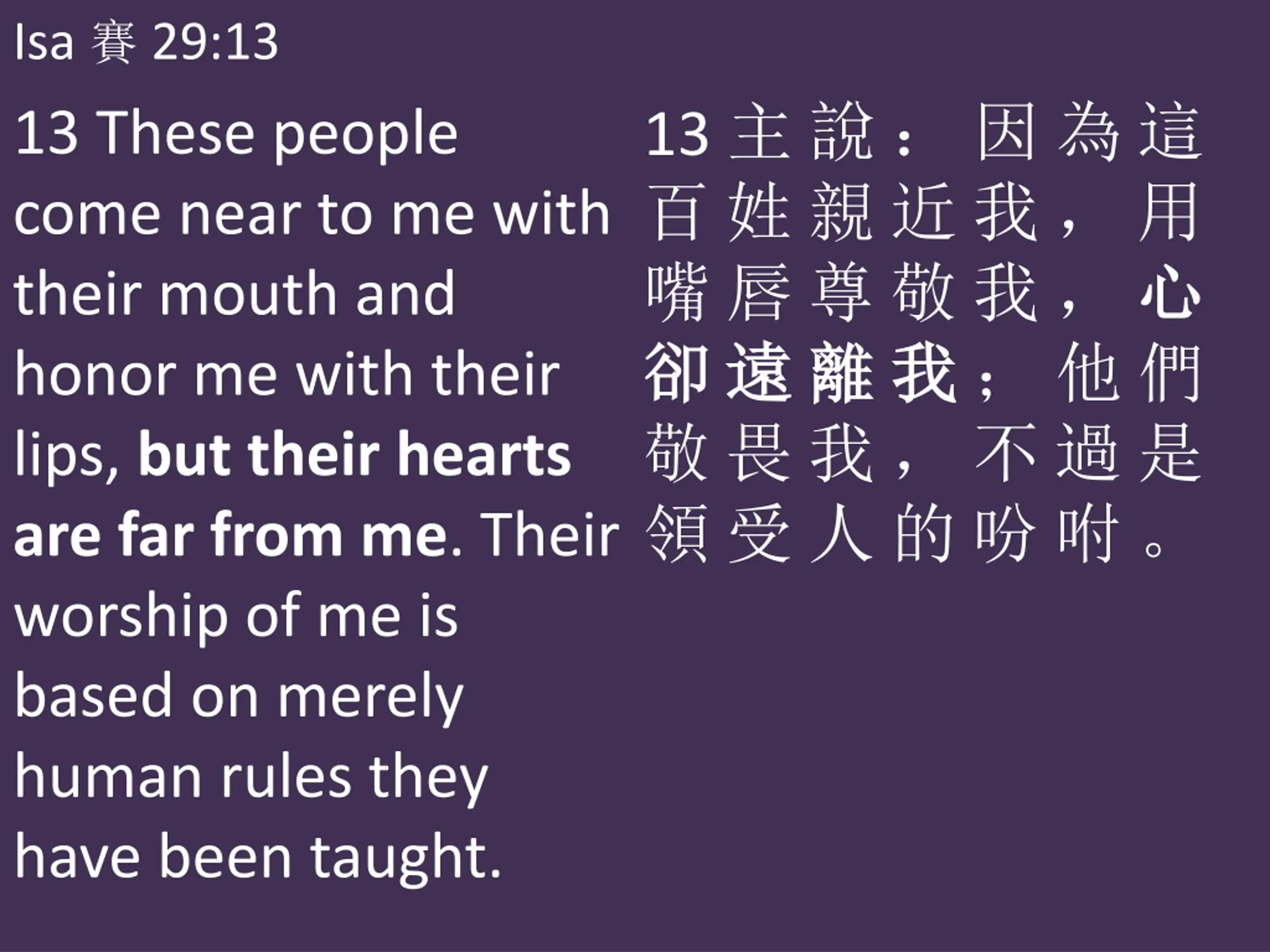 Isa 29:13 13 13 These people come near to me with their mouth and honor me with their lips, but their hearts are far from me. Their worship of me is based on merely human rules they have been taught.