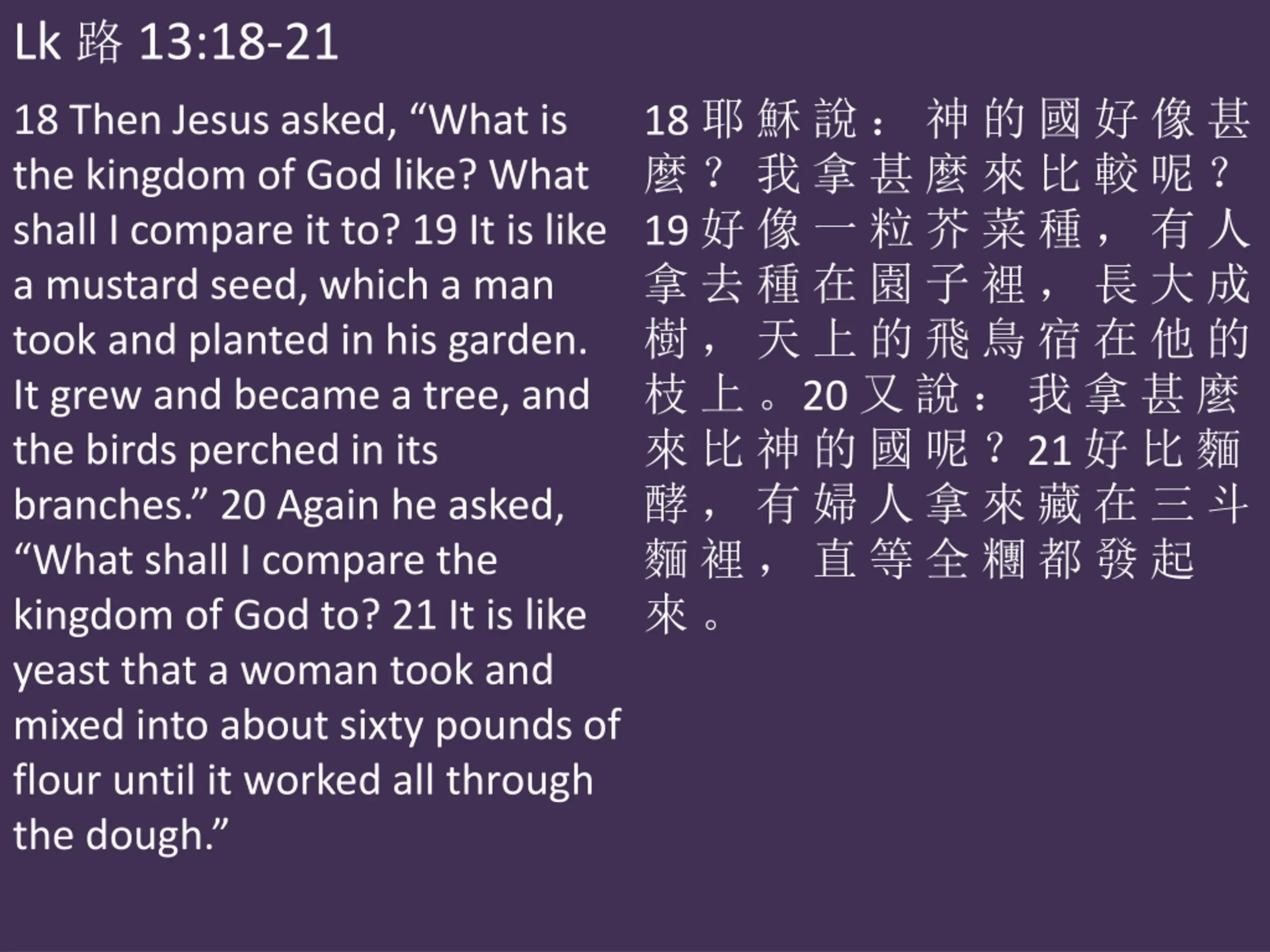 Lk 13:18-21 18 19 20 21 18 Then Jesus asked, What is the kingdom of God like? What shall I compare it to? 19 It is like a mustard seed, which a man took and planted in his garden. It grew and became a tree, and the birds perched in its branches. 20 Again he asked, What shall I compare the kingdom of God to? 21 It is like yeast that a woman took and mixed into about sixty pounds of flour until it worked all through the dough.