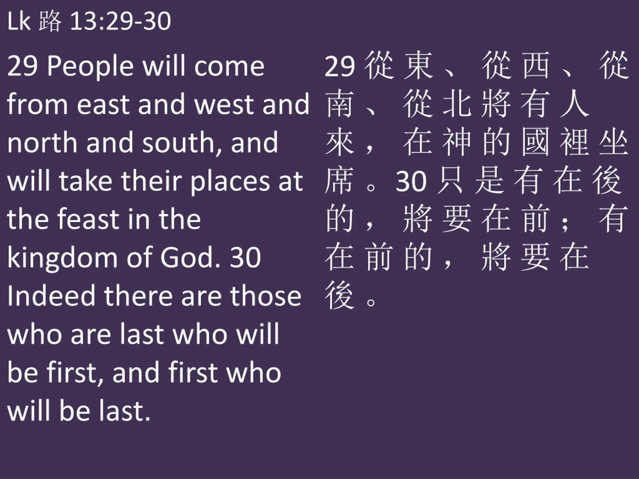 Lk 13:29-30 29 30 29 People will come from east and west and north and south, and will take their places at the feast in the kingdom of God. 30 Indeed there are those who are last who will be first, and first who will be last.