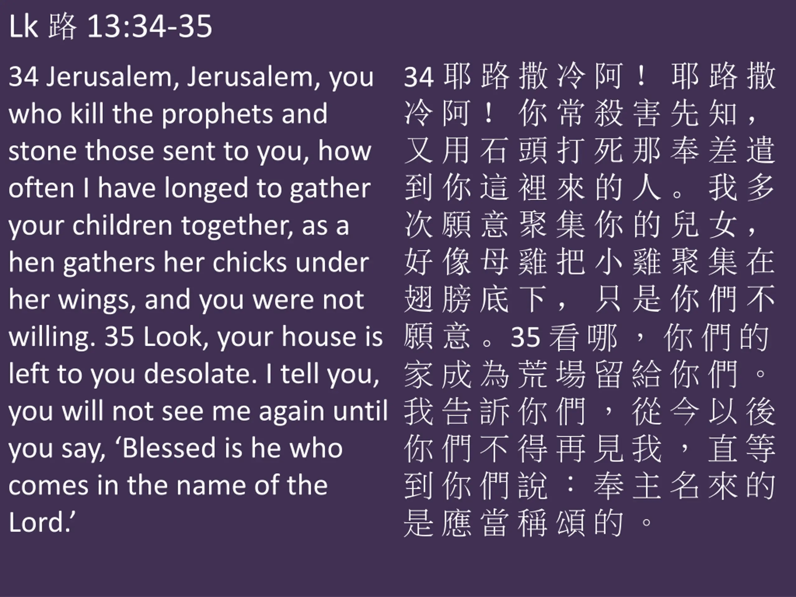 Lk 13:34-35 34 35 34 Jerusalem, Jerusalem, you who kill the prophets and stone those sent to you, how often I have longed to gather your children together, as a hen gathers her chicks under her wings, and you were not willing. 35 Look, your house is left to you desolate. I tell you, you will not see me again until you say, Blessed is he who comes in the name of the Lord.