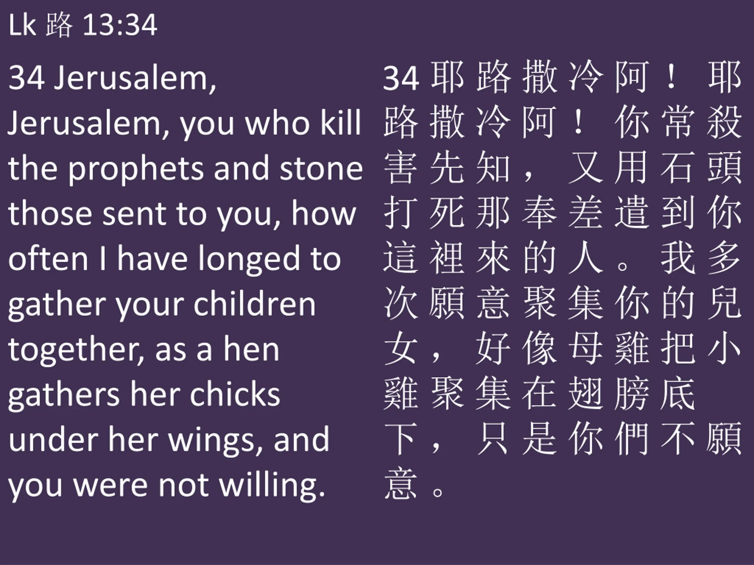 Lk 13:34 34 34 Jerusalem, Jerusalem, you who kill the prophets and stone those sent to you, how often I have longed to gather your children together, as a hen gathers her chicks under her wings, and you were not willing.