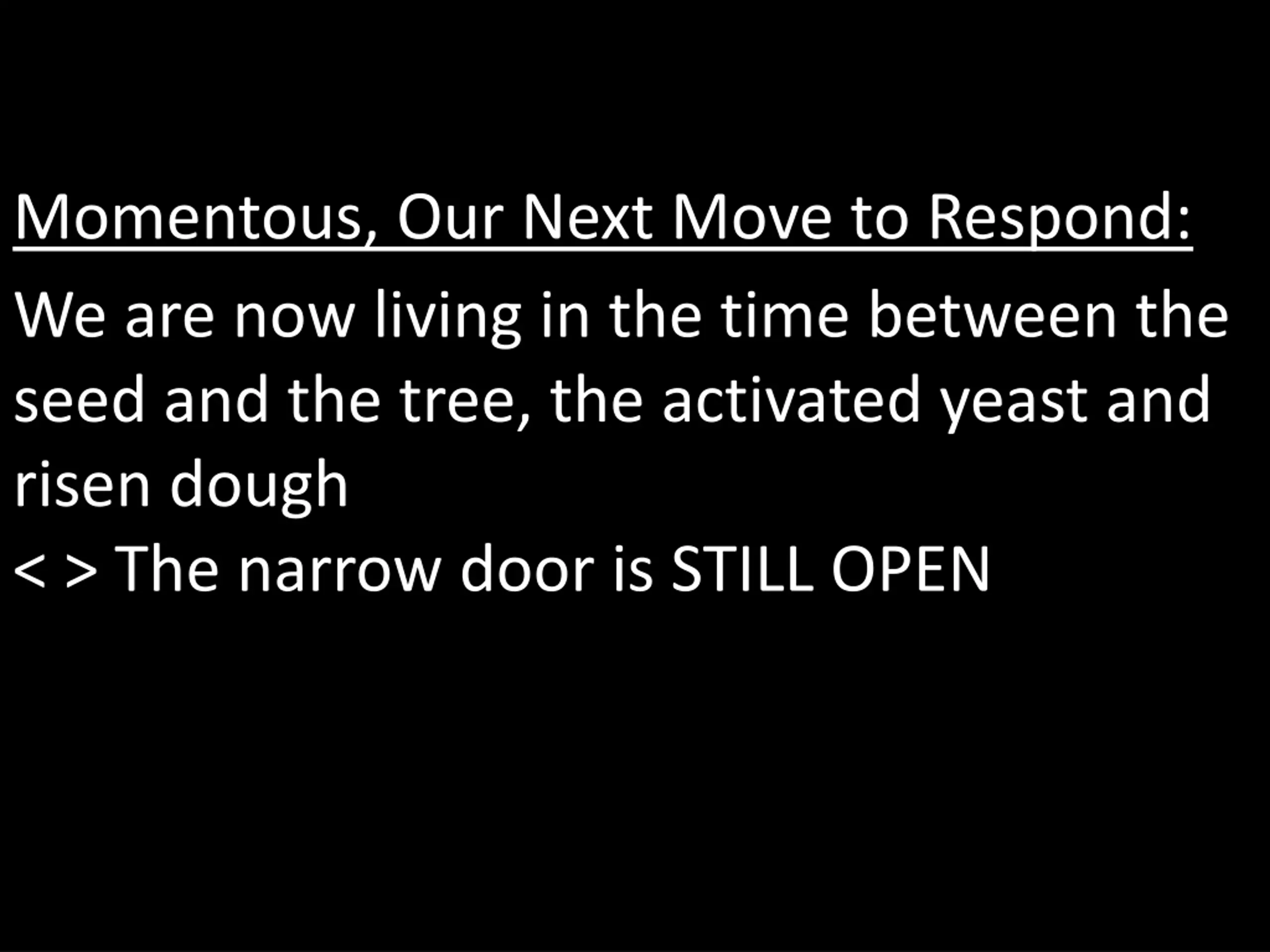 Momentous, Our Next Move to Respond: We are now living in the time between the seed and the tree, the activated yeast and risen dough < > The narrow door is STILL OPEN