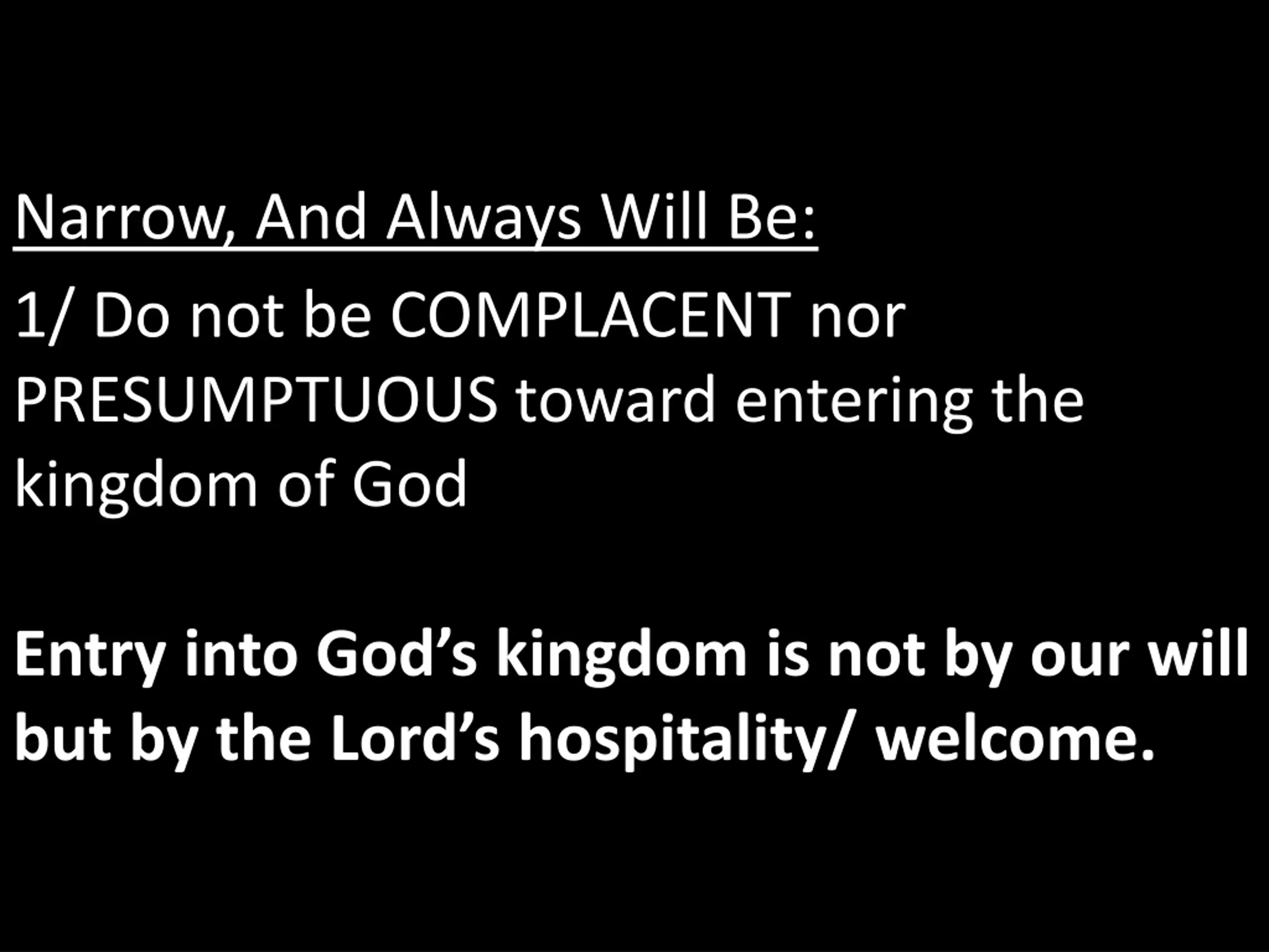 Narrow, And Always Will Be: 1/ Do not be COMPLACENT nor PRESUMPTUOUS toward entering the kingdom of God Entry into God s kingdom is not by our will but by the Lord s hospitality/ welcome.