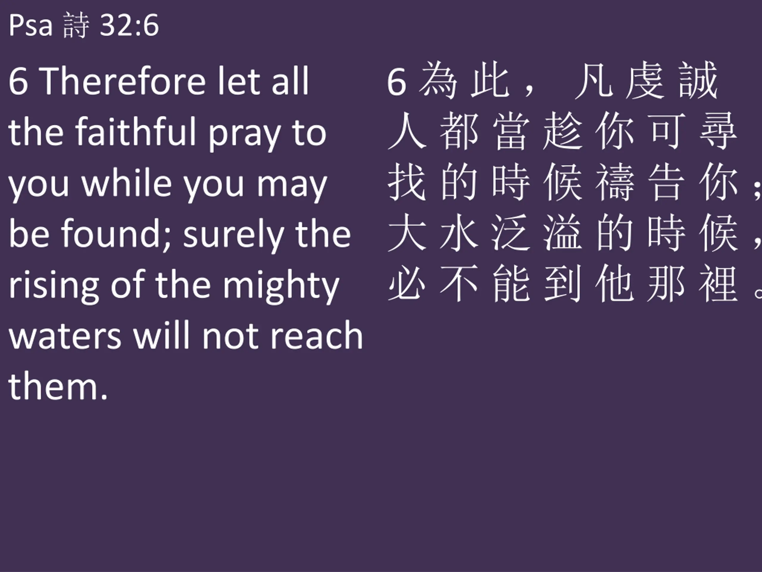 Psa 32:6 6 6 Therefore let all the faithful pray to you while you may be found; surely the rising of the mighty waters will not reach them.