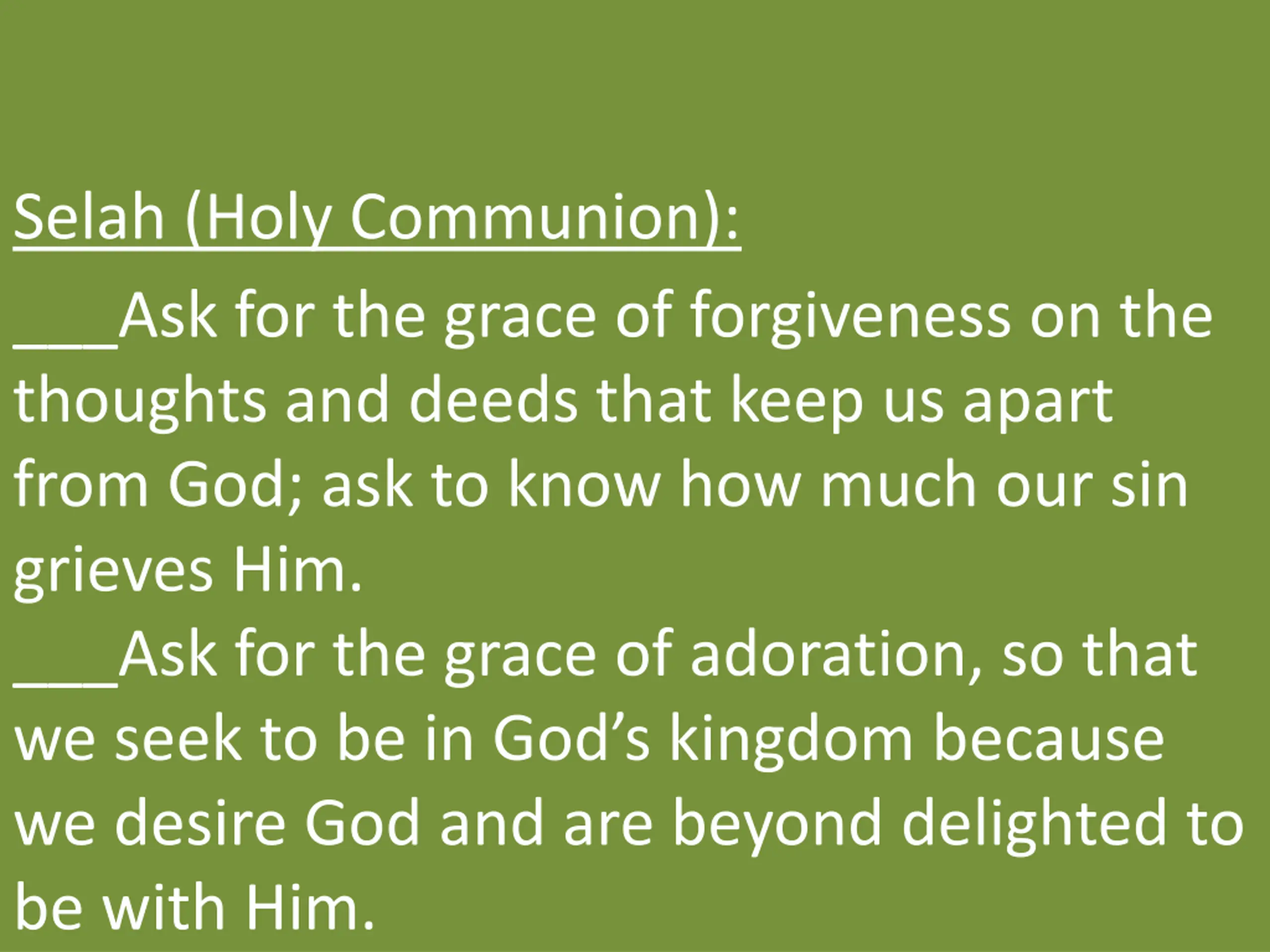Selah (Holy Communion): ___Ask for the grace of forgiveness on the thoughts and deeds that keep us apart from God; ask to know how much our sin grieves Him. ___Ask for the grace of adoration, so that we seek to be in God s kingdom because we desire God and are beyond delighted to be with Him.