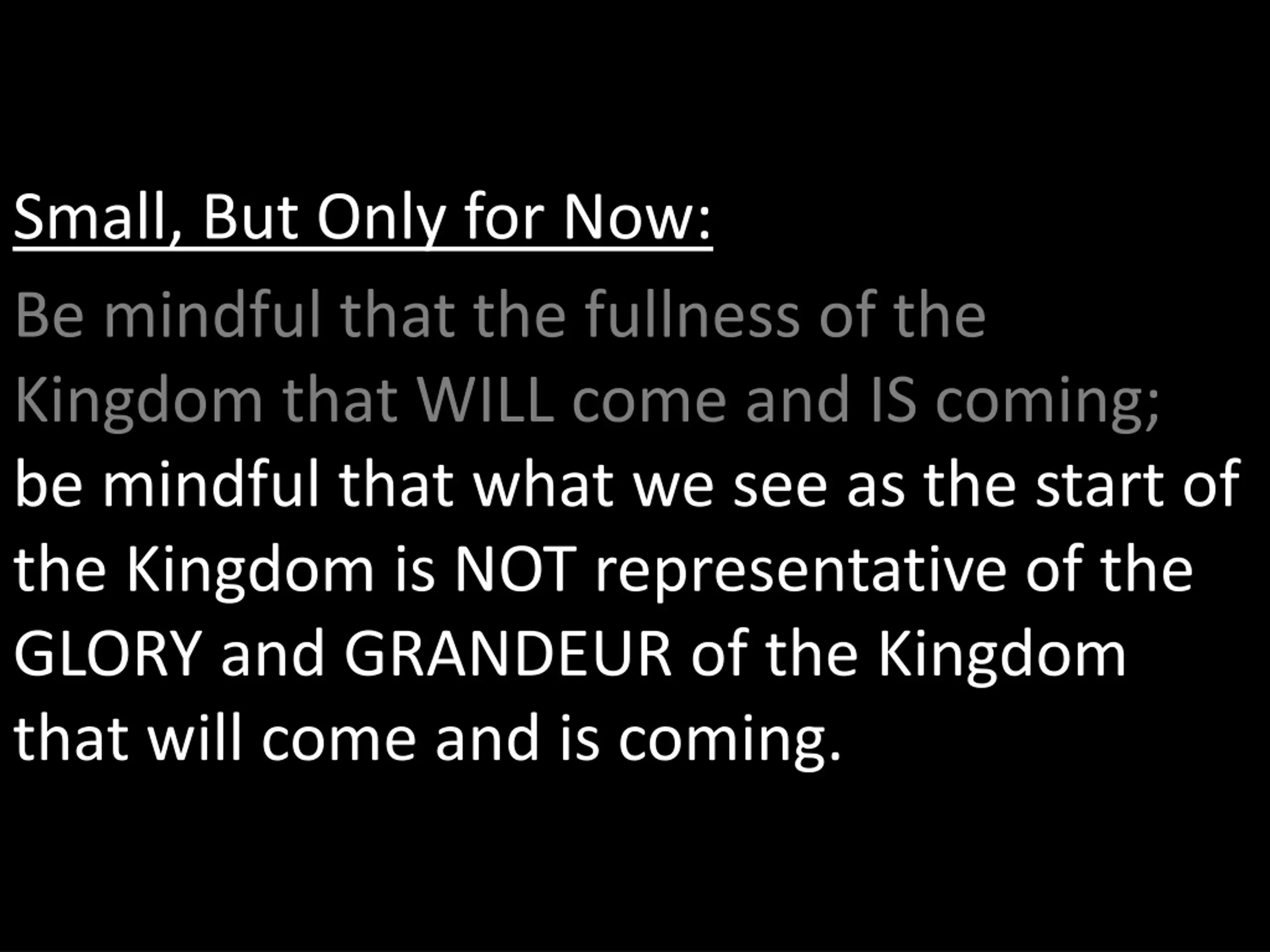 Small, But Only for Now: Be mindful that the fullness of the Kingdom that WILL come and IS coming; be mindful that what we see as the start of the Kingdom is NOT representative of the GLORY and GRANDEUR of the Kingdom that will come and is coming.