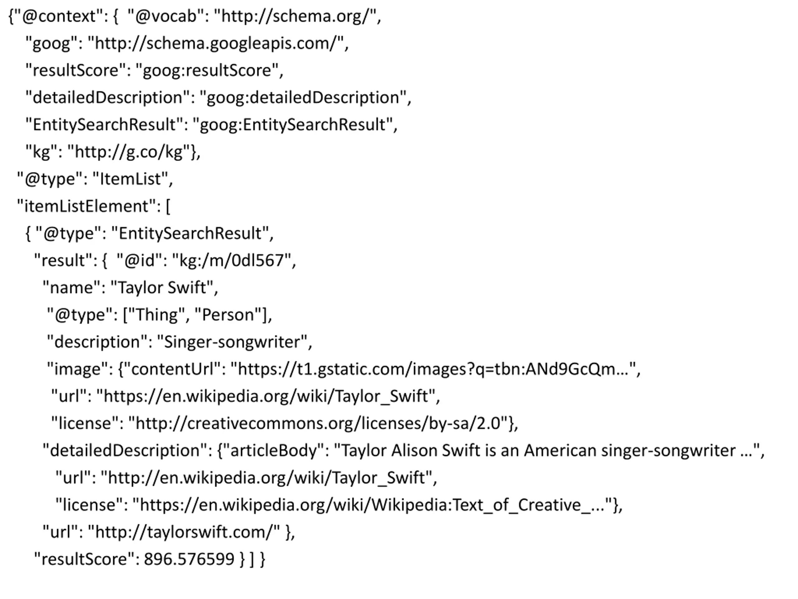 {"@context": { "@vocab": "http://schema.org/", "goog": "http://schema.googleapis.com/", "resultScore": "goog:resultScore", "detailedDescription": "goog:detailedDescription", "EntitySearchResult": "goog:EntitySearchResult", "kg": "http://g.co/kg"}, "@type": "ItemList", "itemListElement": [ { "@type": "EntitySearchResult", "result": { "@id": "kg:/m/0dl567", "name": "Taylor Swift", "@type": ["Thing", "Person"], "description": "Singer-songwriter", "image": {"contentUrl": "https://t1.gstatic.com/images?q=tbn:ANd9GcQm ", "url": "https://en.wikipedia.org/wiki/Taylor_Swift", "license": "http://creativecommons.org/licenses/by-sa/2.0"}, "detailedDescription": {"articleBody": "Taylor Alison Swift is an American singer-songwriter ", "url": "http://en.wikipedia.org/wiki/Taylor_Swift", "license": "https://en.wikipedia.org/wiki/Wikipedia:Text_of_Creative_..."}, "url": "http://taylorswift.com/" }, "resultScore": 896.576599 } ] }