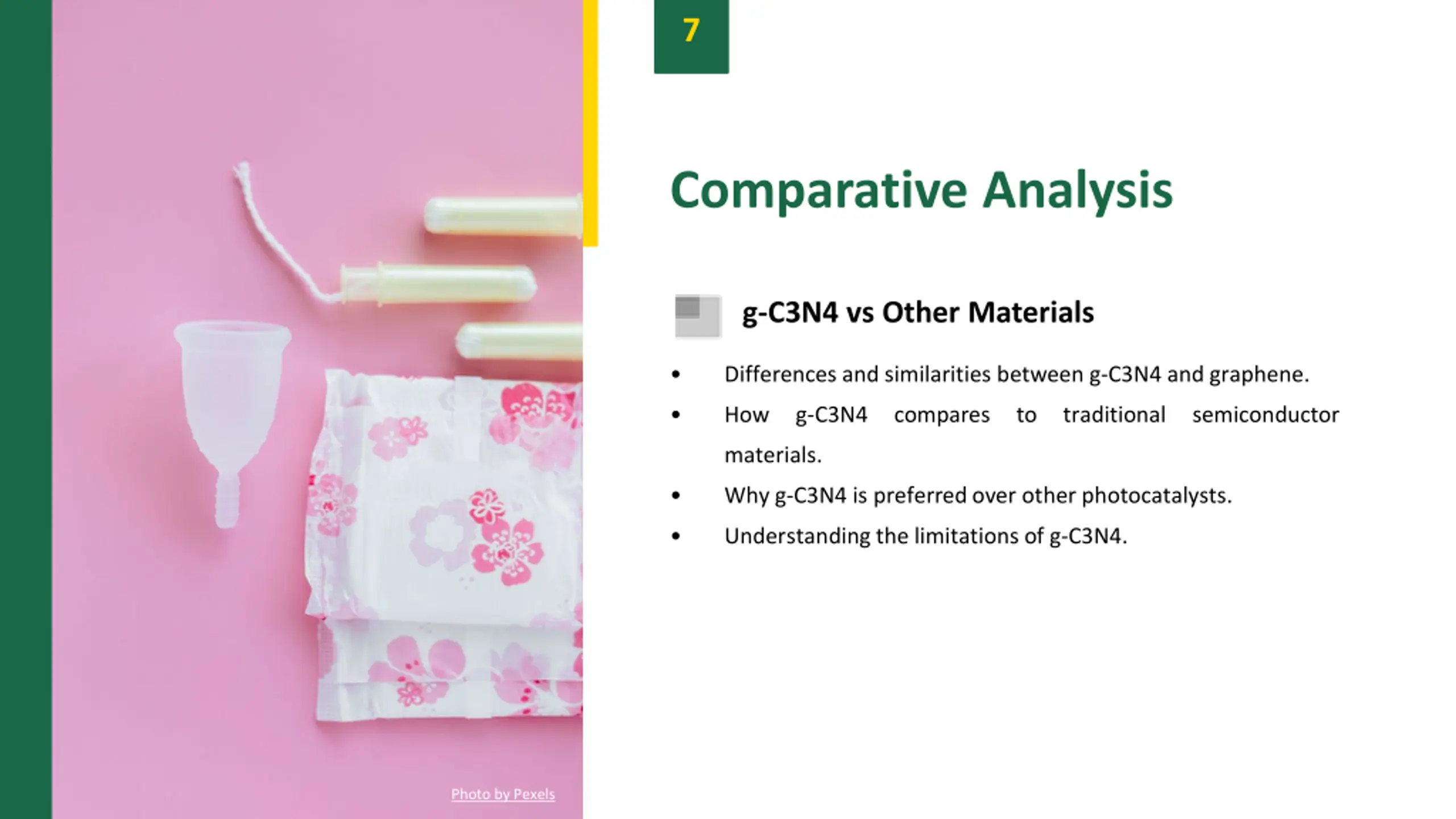7 Comparative Analysis g-C3N4 vs Other Materials Differences and similarities between g-C3N4 and graphene. How g-C3N4 compares to traditional semiconductor materials. Why g-C3N4 is preferredover other photocatalysts. Understanding the limitations of g-C3N4. Photo by Pexels