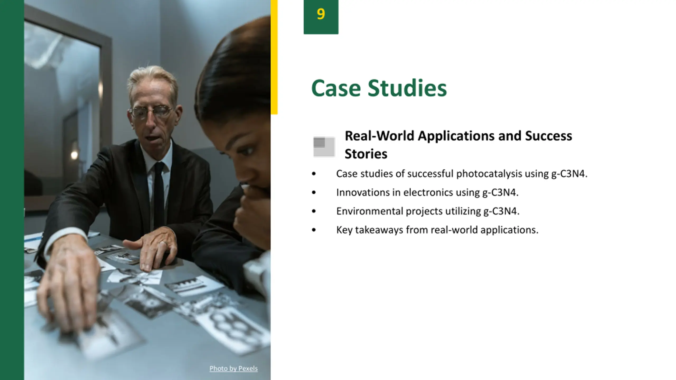 9 Case Studies Real-World Applications and Success Stories Case studies of successful photocatalysis using g-C3N4. Innovations in electronics using g-C3N4. Environmental projects utilizing g-C3N4. Key takeaways from real-world applications. Photo by Pexels