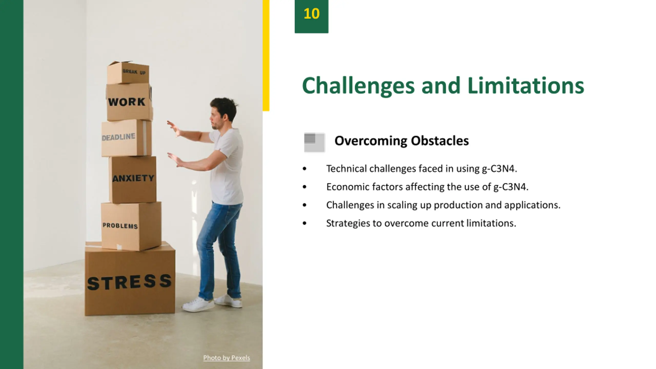 10 Challenges and Limitations Overcoming Obstacles Technical challenges faced in using g-C3N4. Economic factors affecting the use of g-C3N4. Challenges in scaling up production and applications. Strategies to overcome currentlimitations. Photo by Pexels