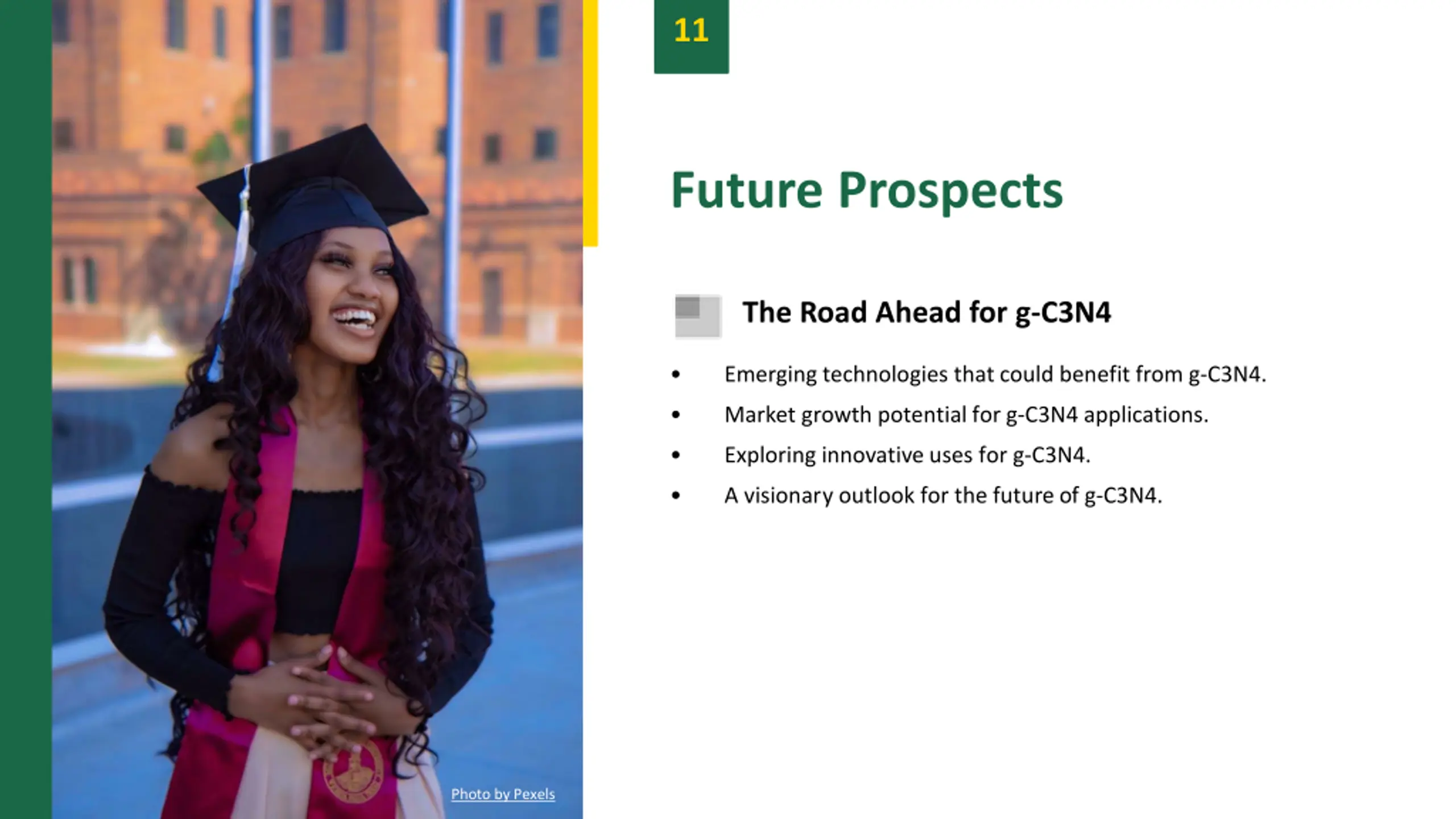 11 Future Prospects The Road Ahead for g-C3N4 Emerging technologies that could benefit from g-C3N4. Market growth potential for g-C3N4 applications. Exploring innovative uses for g-C3N4. A visionary outlook for the future of g-C3N4. Photo by Pexels