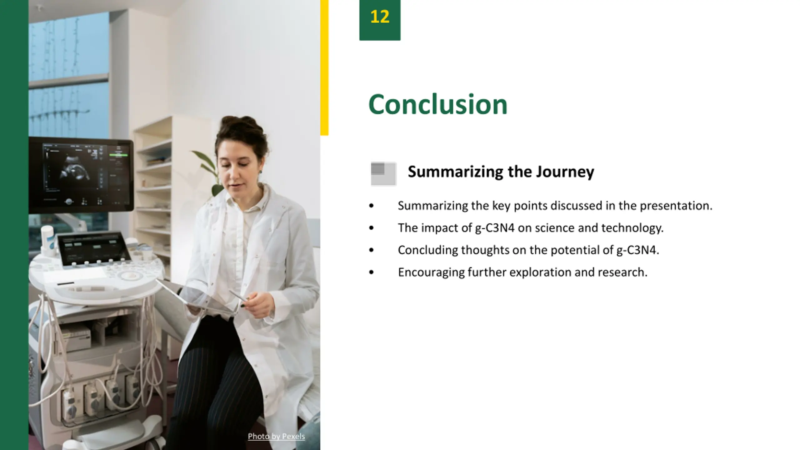 12 Conclusion Summarizing the Journey Summarizing the key points discussed in the presentation. The impact of g-C3N4 on science and technology. Concluding thoughts on the potential of g-C3N4. Encouraging furtherexploration and research. Photo by Pexels
