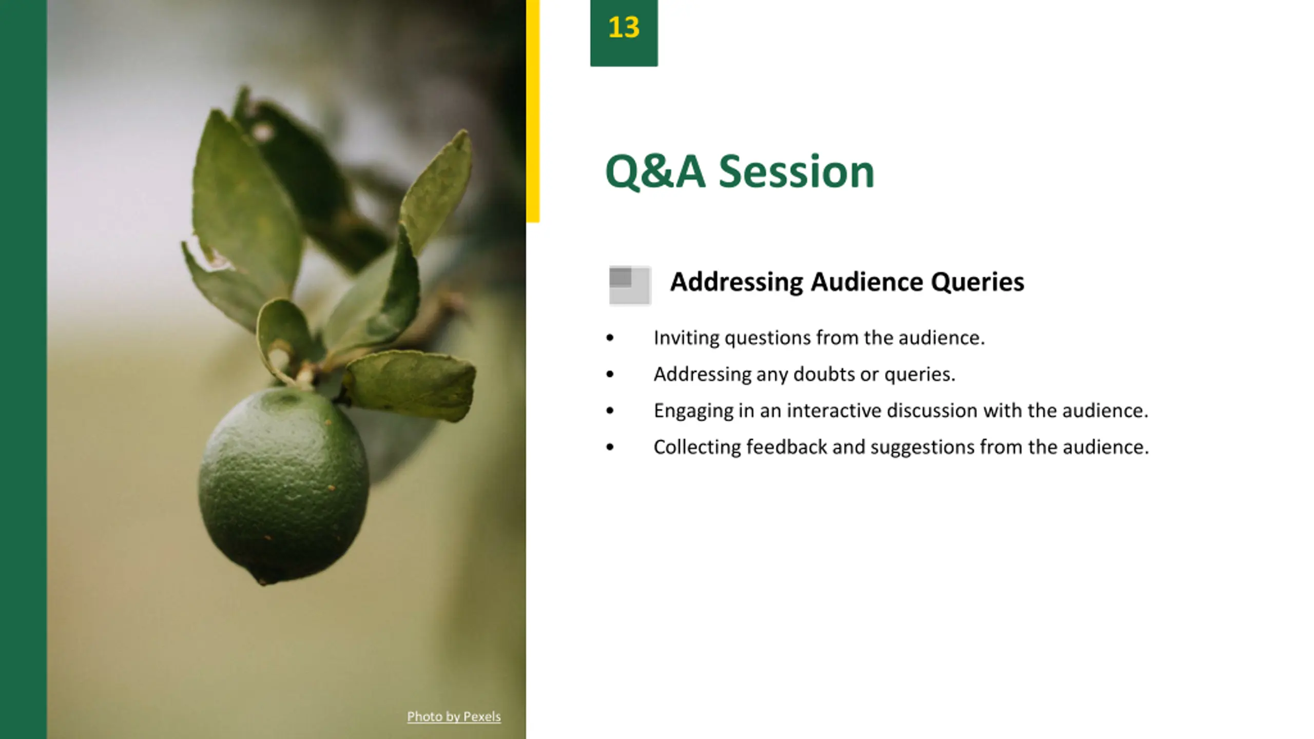 13 Q&A Session Addressing Audience Queries Inviting questions from the audience. Addressing any doubts or queries. Engaging in an interactive discussion with the audience. Collecting feedback and suggestions from the audience. Photo by Pexels