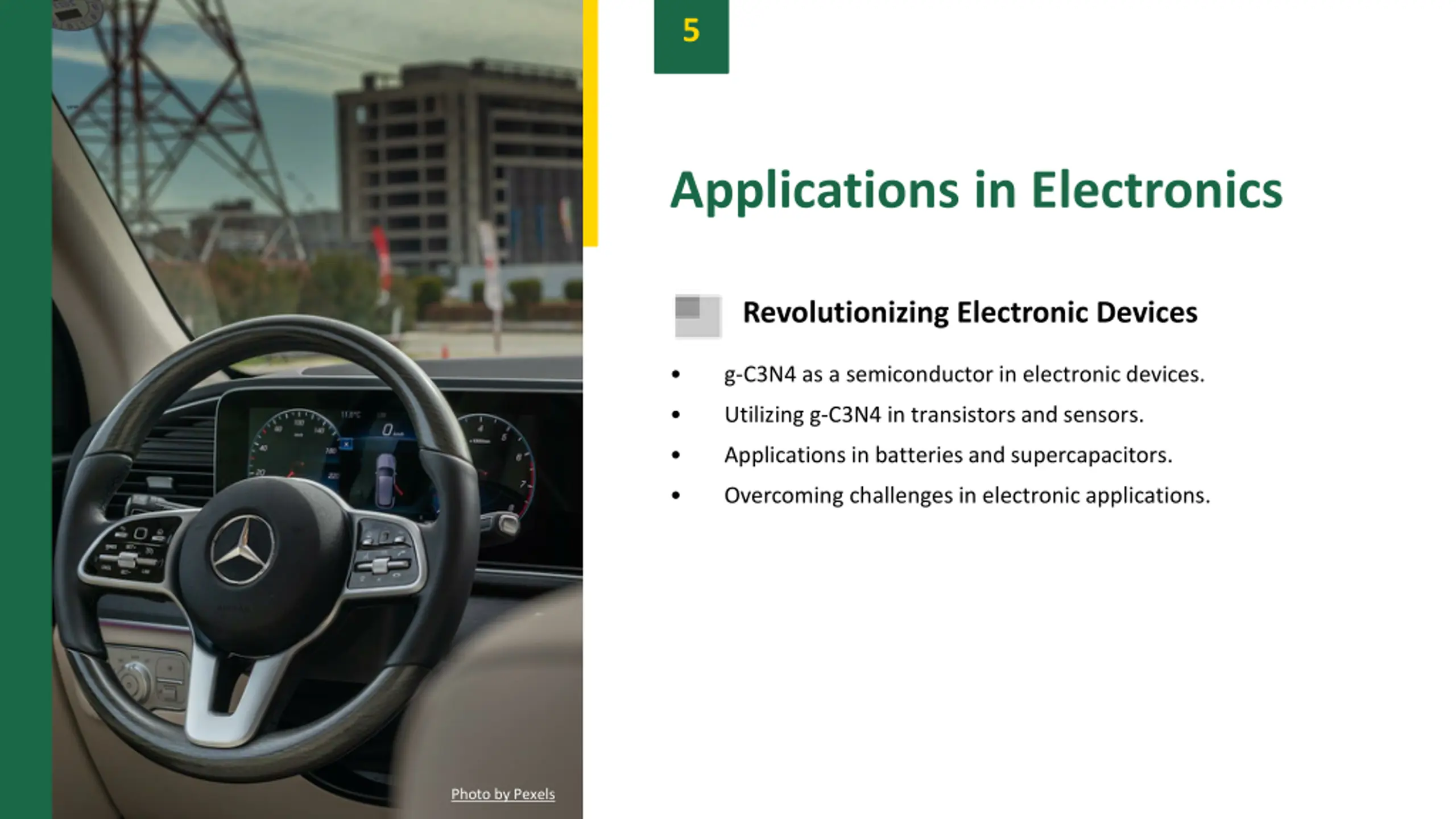 5 Applications in Electronics Revolutionizing Electronic Devices g-C3N4 as a semiconductor in electronic devices. Utilizing g-C3N4 in transistors and sensors. Applications in batteries and supercapacitors. Overcoming challenges in electronic applications. Photo by Pexels