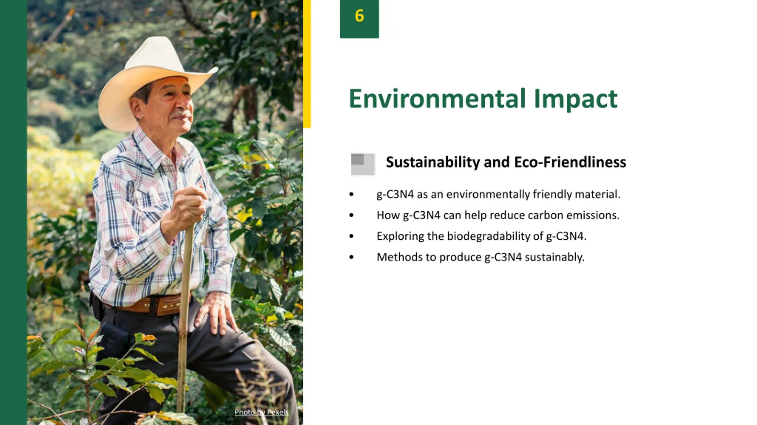 6 Environmental Impact Sustainability and Eco-Friendliness g-C3N4 as an environmentally friendlymaterial. How g-C3N4 can help reduce carbon emissions. Exploring the biodegradability of g-C3N4. Methods to produce g-C3N4 sustainably. Photo by Pexels