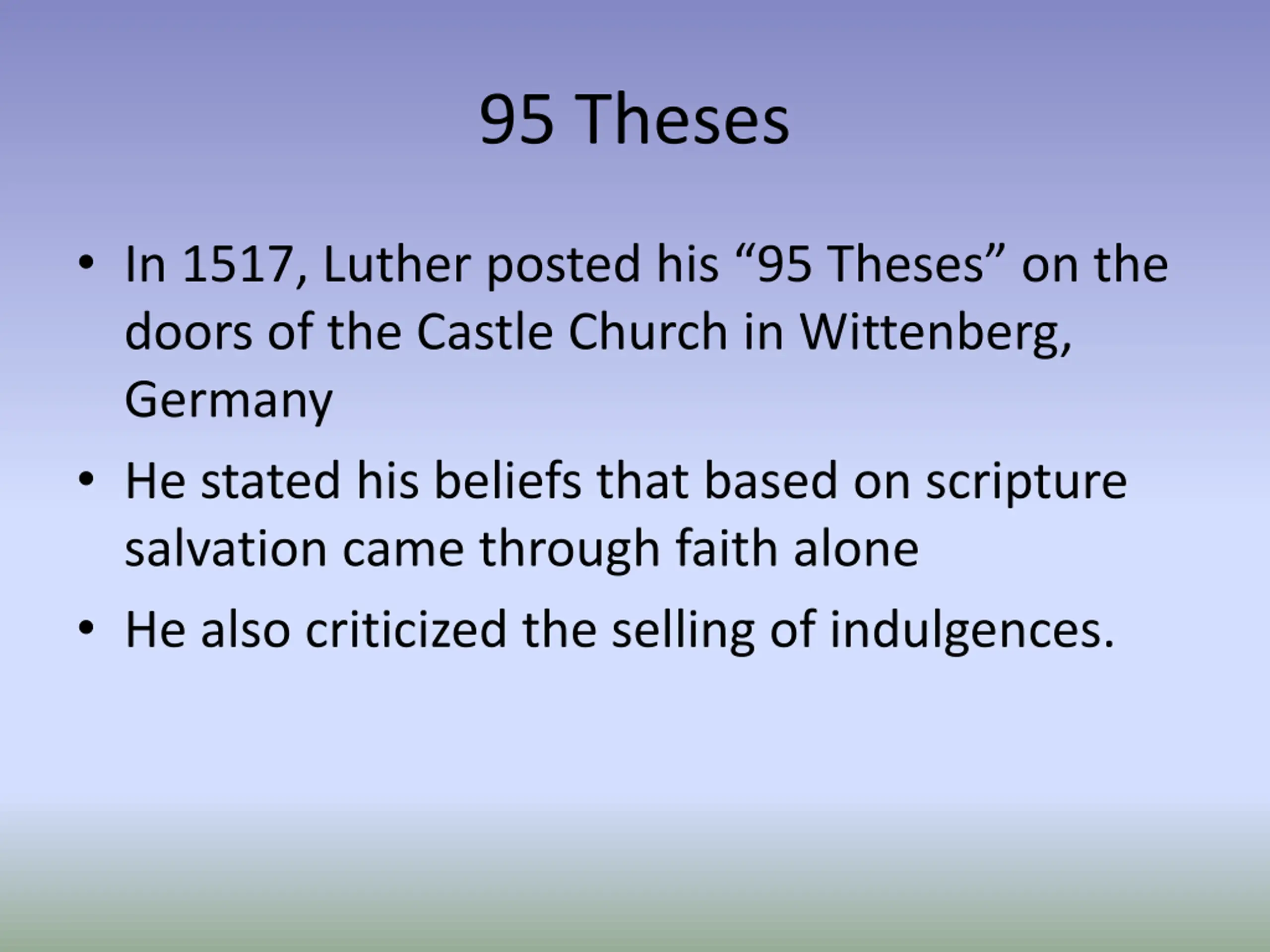 95 Theses In 1517, Luther posted his 95 Theses on the doors of the Castle Church in Wittenberg, Germany He stated his beliefs that based on scripture salvation came through faith alone He also criticized the selling of indulgences.
