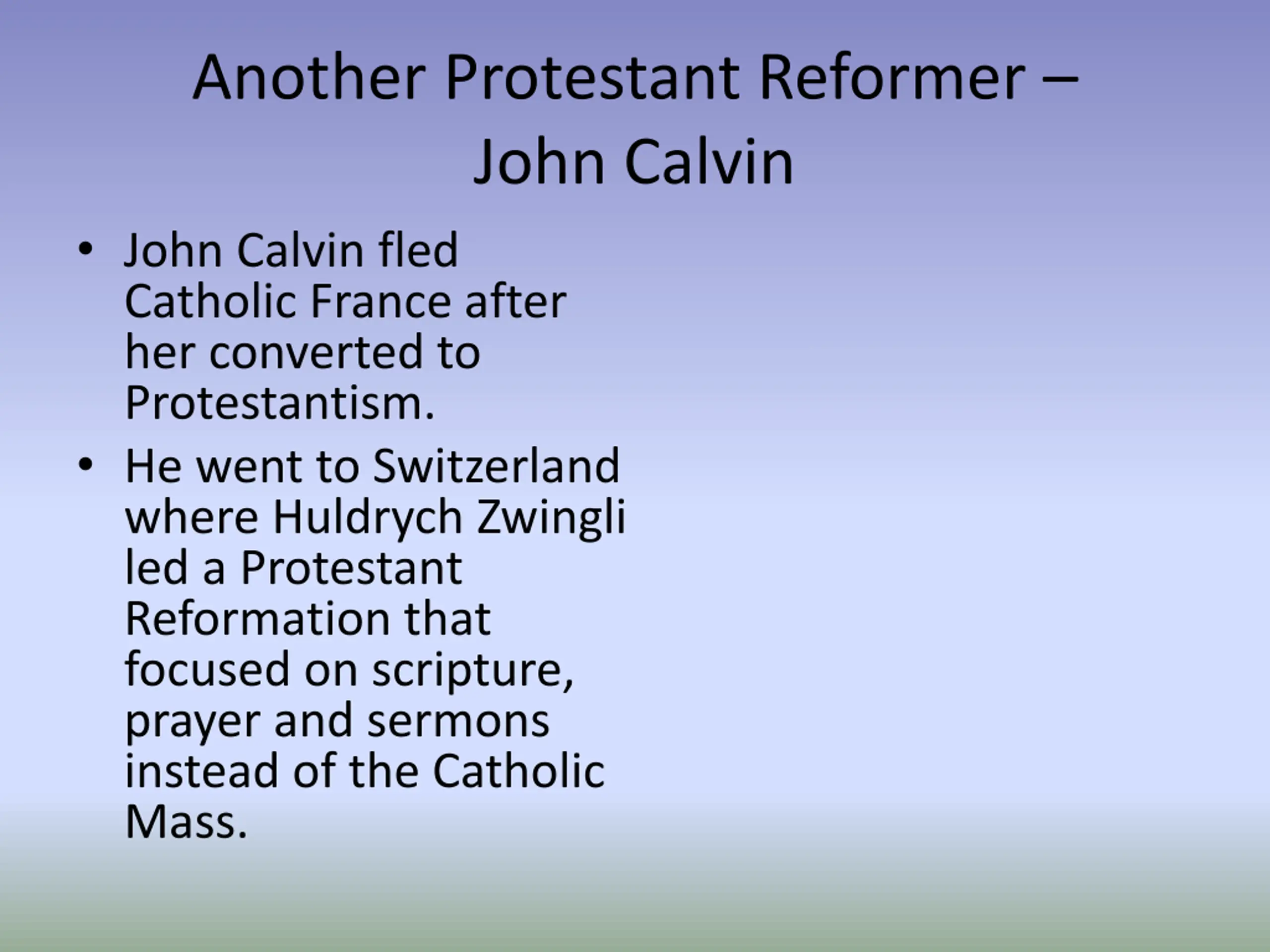 Another Protestant Reformer John Calvin John Calvin fled Catholic France after her converted to Protestantism. He went to Switzerland where Huldrych Zwingli led a Protestant Reformation that focused on scripture, prayer and sermons instead of the Catholic Mass.